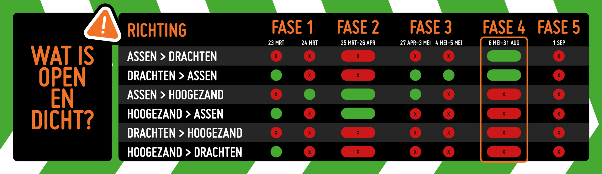 - 27 juli-30 augustus: toerit richting Drachten, vanaf de rotondes Stadspark. Ook kun je niet meer vanaf Laan Corpus richting Ring West of Ring Zuid.