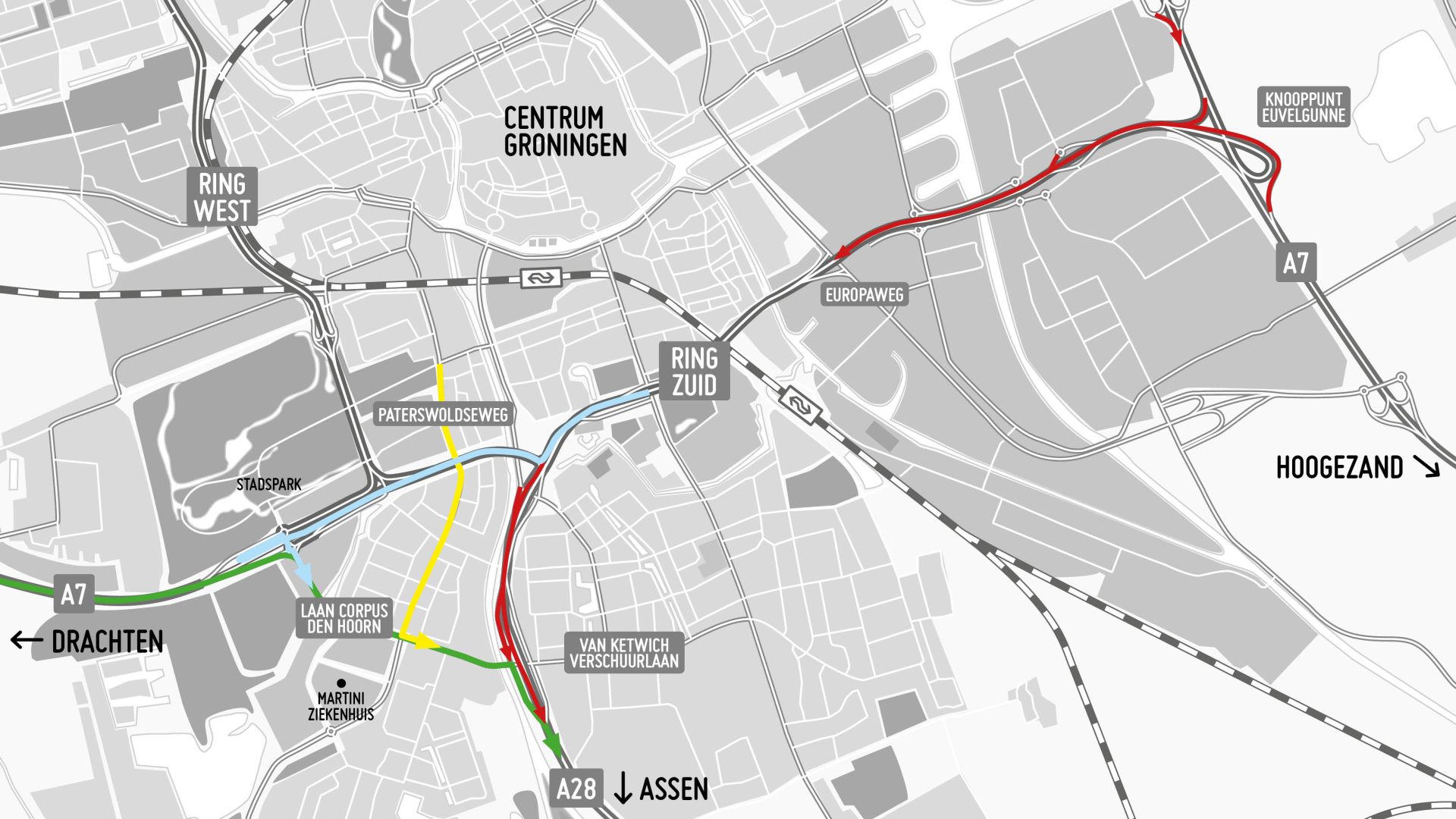 - Kom je uit het centrum van Groningen, dan kun je niet via de Brailleweg de A28 op rijden. Je wordt omgeleid via de Paterswoldseweg en de Laan Corpus den Hoorn (gele route).