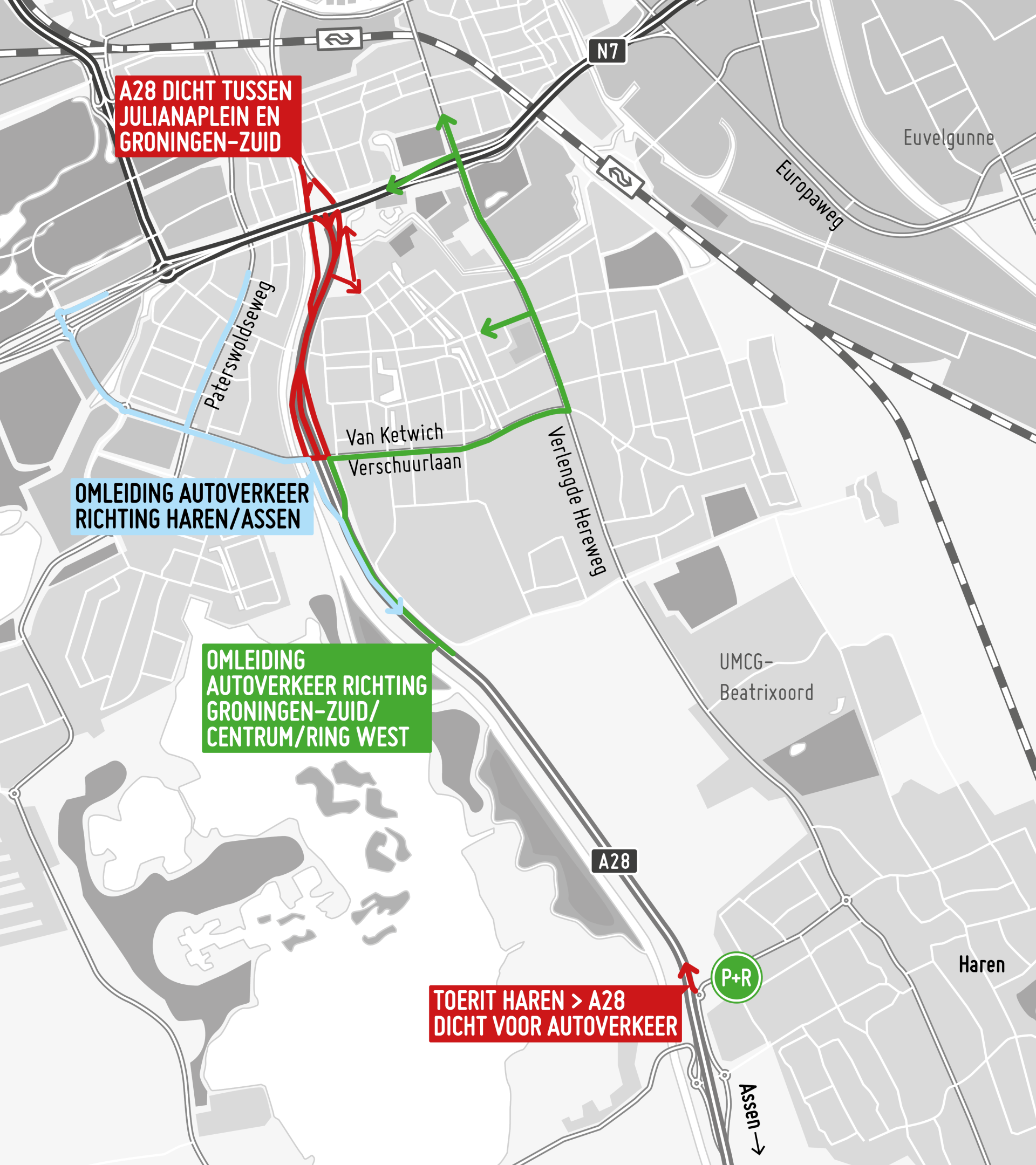 Automobilisten vanuit de richting Assen worden aangeraden via P+R Haren naar Groningen te reizen. De bus mag wel over de oprit vanaf Haren en heeft vervolgens gedeeltelijk vrije doorgang over de vluchtstrook van de A28. Bovendien hebben de bussen een eigen route richting het centrum. De verwachting is dat het autoverkeer veel meer verkeershinder ondervindt.