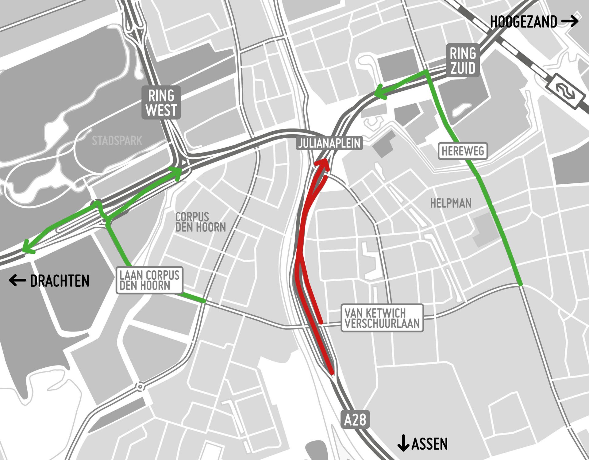 Lokaal verkeer op de A28 richting Groningen, kan via afrit 39 Groningen-Zuid naar de Laan Corpus den Hoorn en daarna via het Vrijheidsplein naar de westelijke ringweg of de zuidelijke ringweg (N7). Je kunt ook via de Hereweg naar de zuidelijke ringweg richting het Julianaplein. Verkeer eerder op de A28 wordt bij Meppel via de A32 naar de A7 bij Heerenveen geleid om zo naar Groningen te rijden. Vanuit Gieten wordt verkeer via de N33 naar de A7 geleid richting Groningen.