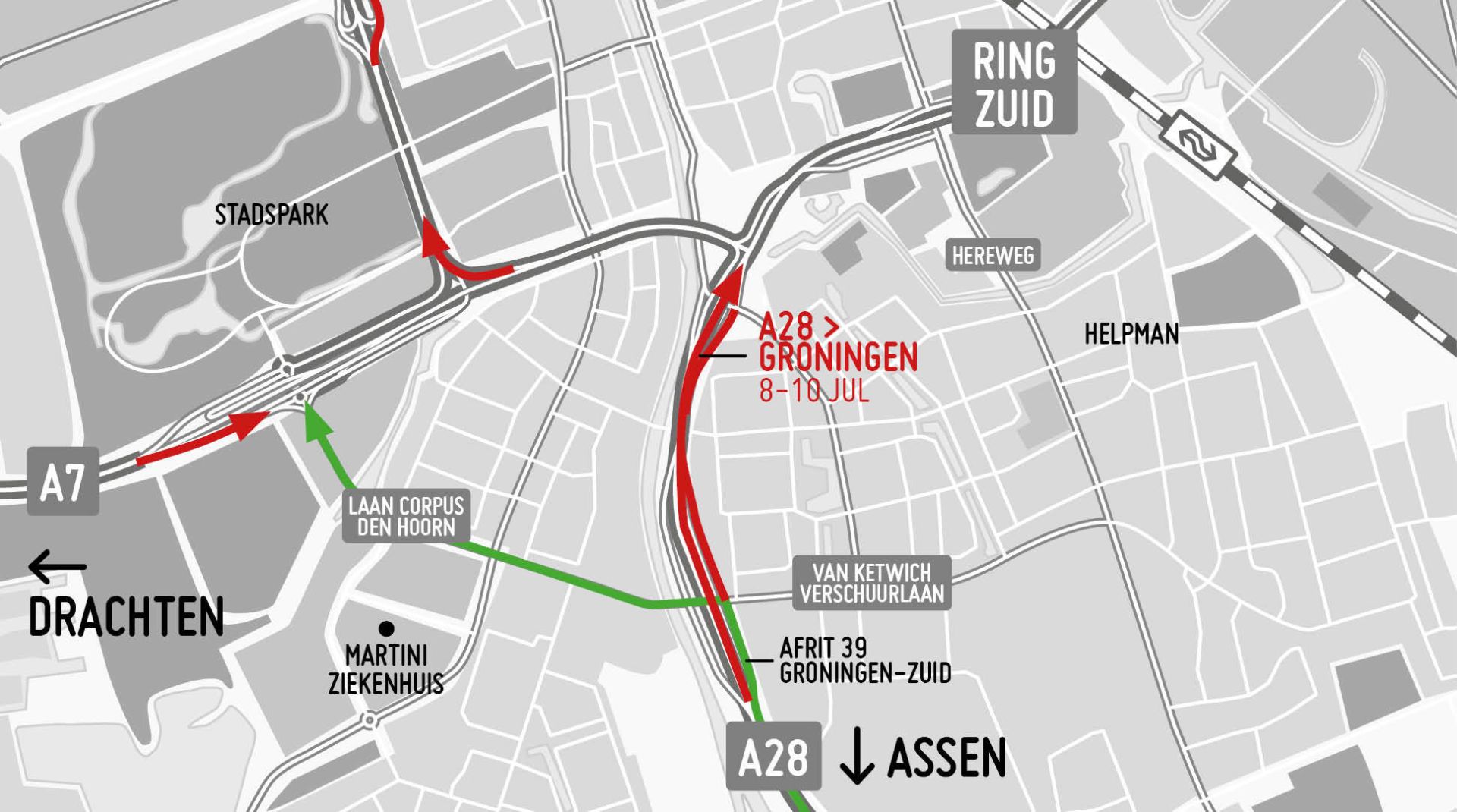 Zaterdag 8 juli om 01.00 uur 's nachts gaat de A28 in één richting dicht van Groningen Zuid tot het Julianaplein. Dat duurt tot maandag 10 juli 07.00 uur. Daarna is één rijstrook dicht richting Groningen. Vanaf maandag 28 augustus 06.00 uur zijn beide rijstroken weer beschikbaar.
