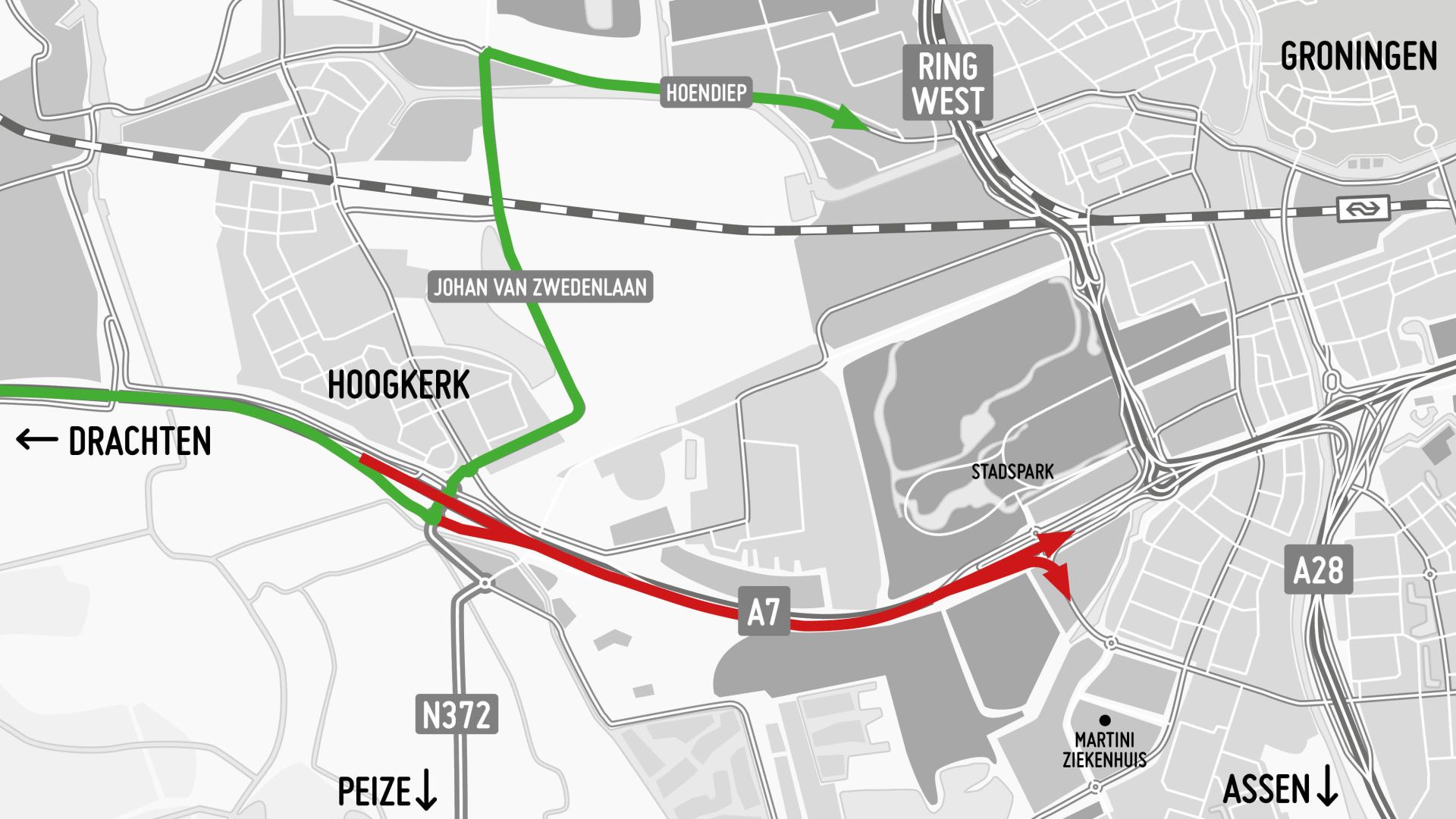 Verkeer richting Groningen wordt bij afrit 35 Hoogkerk de A7 af geleid. Via de Johan van Zwedenlaan en het Hoendiep rijd je richting Groningen. Bij de westelijke ringweg kun je je weg vervolgen, bijvoorbeeld richting Julianaplein en Ring Zuid of naar Groningen-West, waar onder andere het Martini Ziekenhuis is.