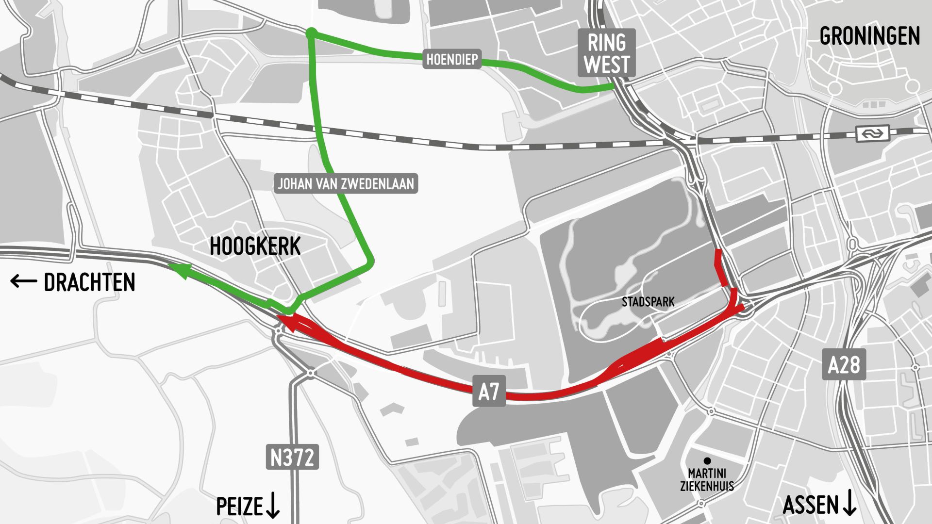 Het verkeer richting Hoogkerk/Drachten wordt omgeleid via Ring West, het Hoendiep en de Johan van Zwedenlaan. Bij de toe- en afritten Hoogkerk kan het verkeer de A7 weer bereiken.
