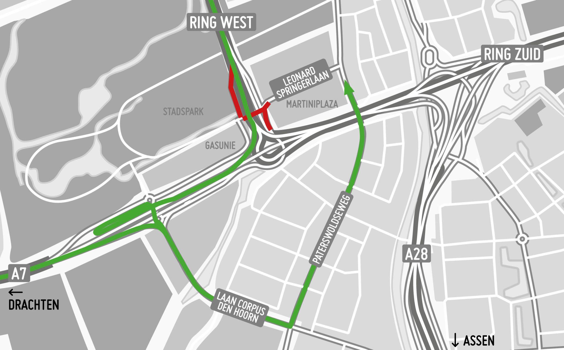 De onderdoorgang van het viaduct is in één richting dicht. Het verkeer kan niet vanaf de Gasunie naar Martiniplaza rijden. Andersom kan wel. De toeritten vanaf de Leonard Springerlaan naar de westelijke ringweg blijven ook open.