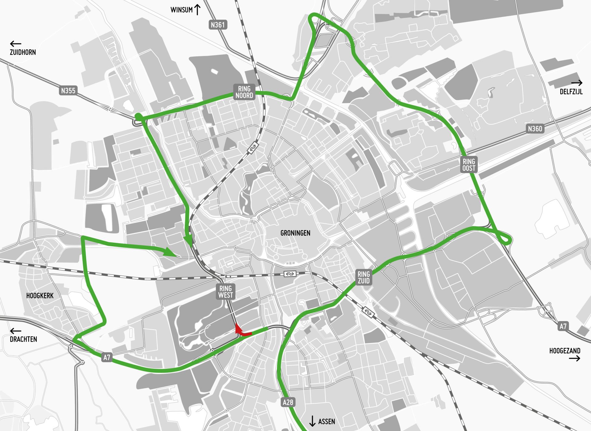 Verkeer vanuit de richting Assen heeft twee opties, afhankelijk van de bestemming. Optie één is om via de zuidelijke, oostelijke en noordelijke ringweg naar Ring West te rijden. De tweede optie is bij Hoogkerk (afrit 35) van de A7 te gaan en via de Johan van Zwedenlaan en het Hoendiep weer naar Ring West te rijden. Verkeer vanuit Hoogezand wordt omgeleid via de overige ringwegen. Automobilisten kunnen de gele borden met nummer 8 volgen voor deze omleiding.
