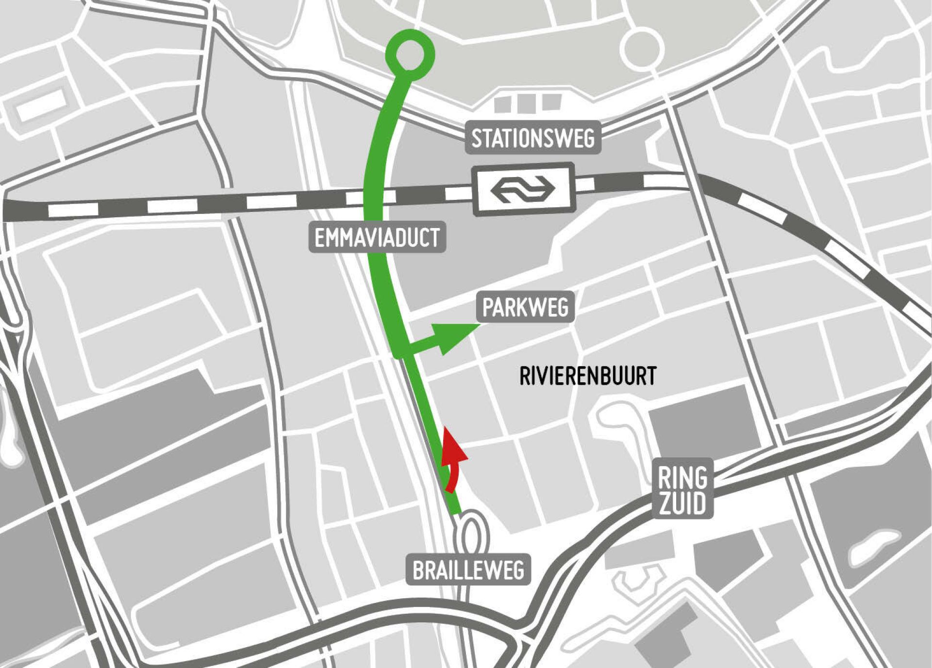 De afrit Rivierenbuurt, vanaf de ovonde bij de Brailleweg, is van maandag 5 februari 07.00 uur tot vrijdag 1 maart 15.00 uur dicht. De afrit wordt definitief ingericht. Verkeer naar de Rivierenbuurt wordt omgeleid via de Parkweg.