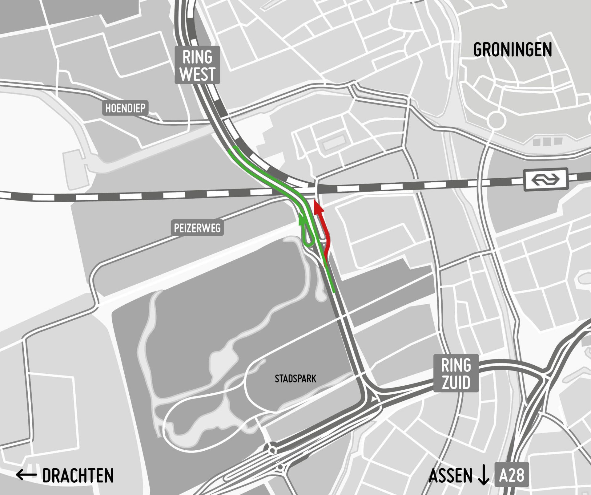Verkeer vanaf het Julianaplein of vanuit de richting Drachten rijdt om via afrit 17 Hoendiep. Onderaan de afrit neem je de rotonde en rijd je via de toerit terug de westelijke ringweg op. Vanuit die richting is afrit 18 naar de Peizerweg wel te bereiken.