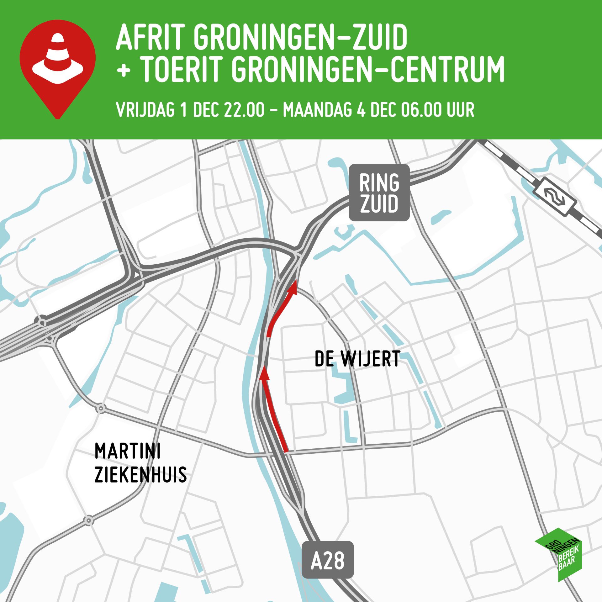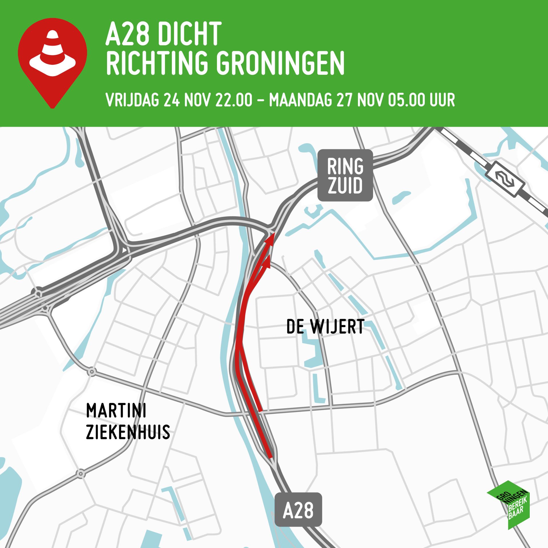 In het weekend van vrijdag 24 november 22.00 uur tot maandag 27 november 05.00 uur is de A28 richting de stad dicht. Het verkeer wordt vanaf Groningen-Zuid van de snelweg gehaald en naar de Van Ketwich Verschuurlaan geleid. Hier kan het verkeer naar links richting het westen van de stad of rechtsaf richting Hereweg. In dit weekend gaat de aannemer langs de A28 bomen planten. Een weekend later (vrijdag 1 tot maandag 4 december) zijn op de A28 de oprit vanaf de Van Ketwich Verschuurlaan richting het Julianaplein en de afrit Groningen-Centrum (Brailleweg) afgesloten. Ook dit is vanwege het planten van groen en bomen. De hoofdrijbaan van de A28 blijft gewoon open.