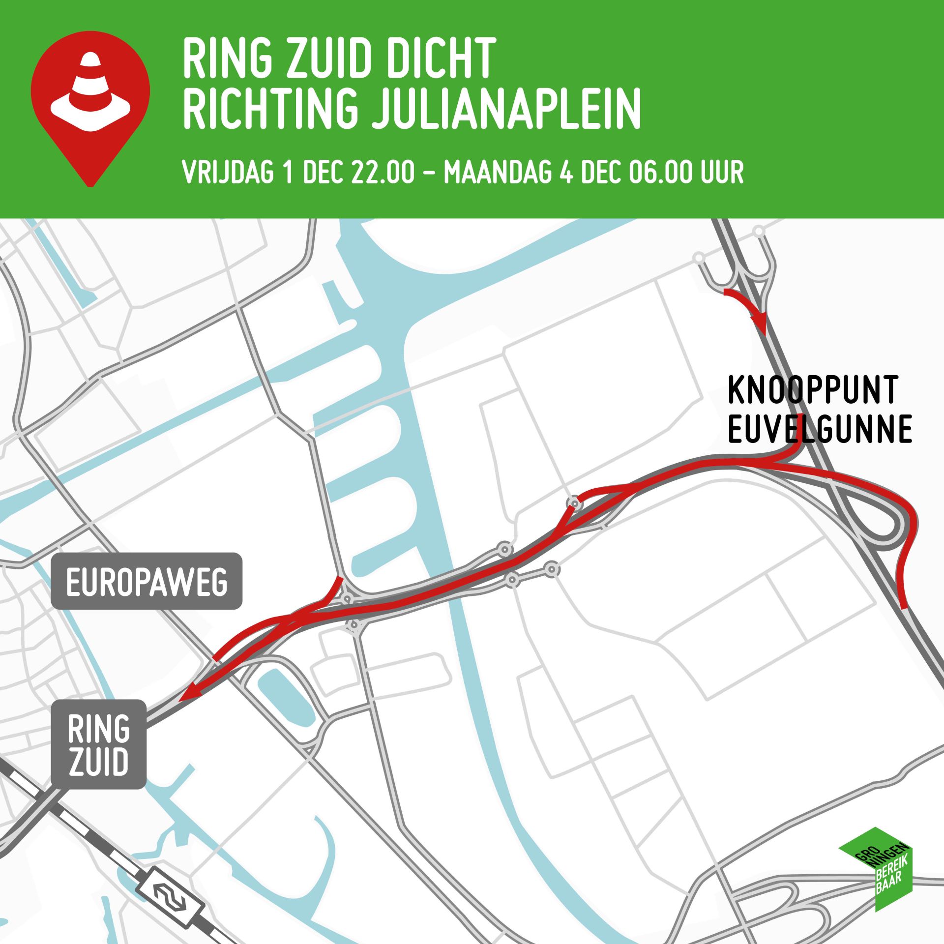 In het weekend van vrijdag 1 tot maandag 4 december worden er ook bomen geplant langs de noordkant van de zuidelijke ringweg. Daardoor is de ringweg dicht vanaf knooppunt Euvelgunne tot aan de Europaweg. Het verkeer op de A7 vanuit Hoogezand kan bij knooppunt Westerbroek via de Europaweg ('de oude A7') richting de stad. In het weekenden van 8 tot 11 december en van 15 tot 18 december is de zuidelijke ringweg in beide rijrichtingen afgesloten tussen de Europaweg en knooppunt Euvelgunne. Dit is vanwege het planten van groen en het afronden van technische werkzaamheden aan de Hoge Euvelgunnerbrug.