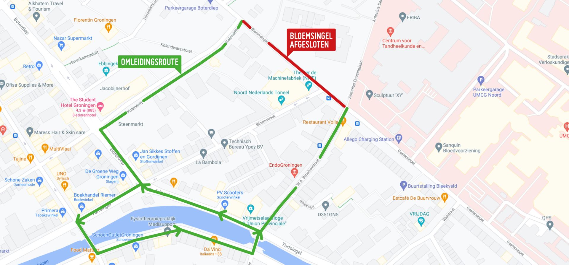 De afsluiting van de Bloemsingel is nodig vanwege de aanleg van het busknooppunt UMCG-Noord. Autoverkeer vanaf de Bloemsingel richting Oostersingel kan de werkzaamheden passeren onder begeleiding van verkeersregelaars.
