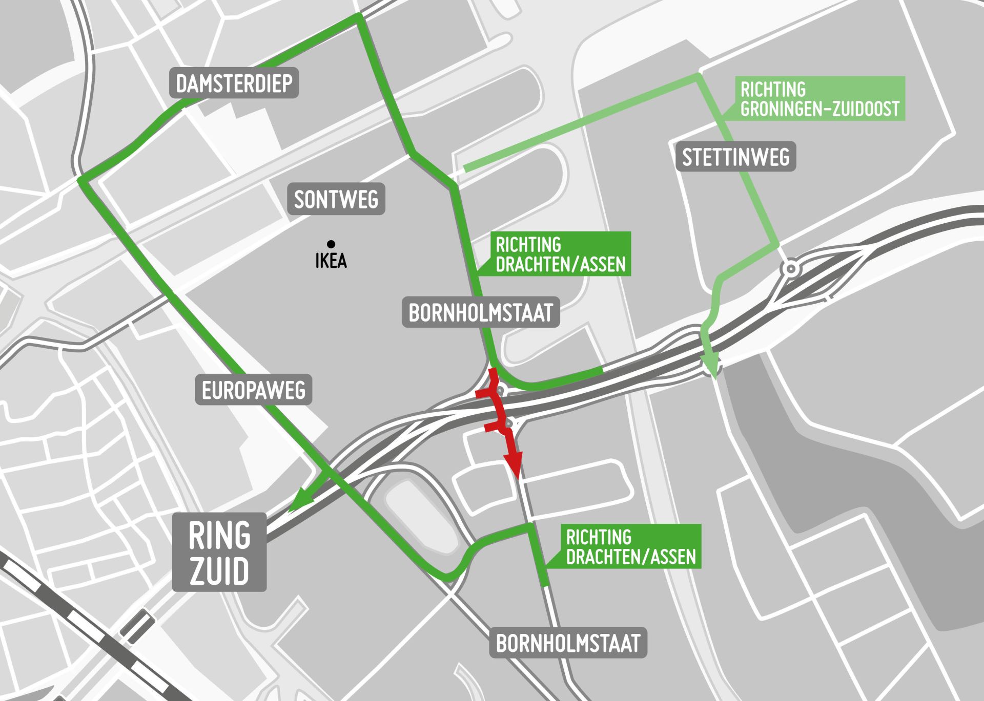 Verkeer vanaf de Osloweg of vanaf de Bornholmstraat ten zuiden van Ring Zuid, kan niet gebruikmaken van de toerit richting Julianaplein. Via de toerit vanaf de Europaweg kun je de zuidelijke ringweg bereiken richting Drachten en Assen.