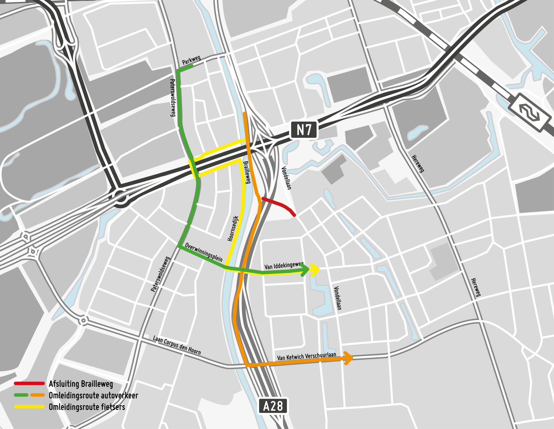 In het weekend van vrijdag 1 tot maandag 4 oktober is de Brailleweg ook afgesloten. Dit weekend is ook de oprit naar de A28 vanaf de Brailleweg dicht.