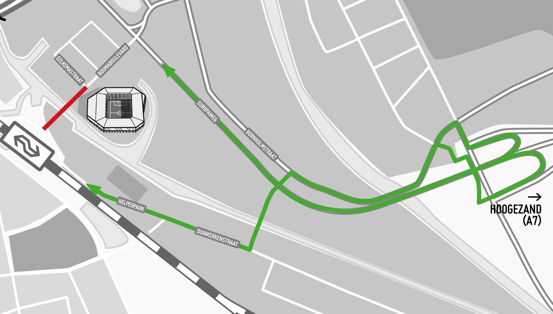 De omleidingsroute wordt met gele borden aangegeven. Automobilisten rijden via de Europaweg (afslag Westerbroek) - Bornholmstraat - Winschoterweg - Duinkerkenstraat - Helperpark en andersom. Zie ook het kaartje hierboven.