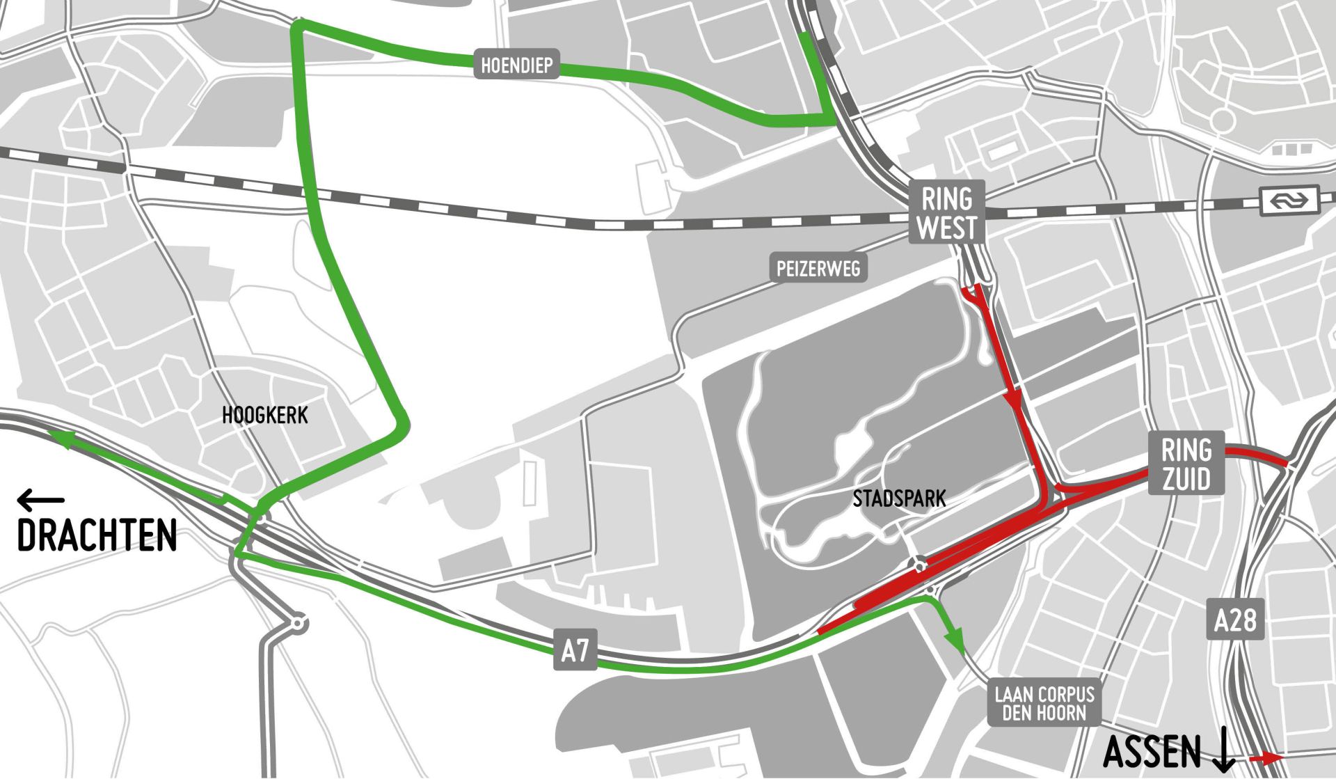 Komend weekend, van vrijdag 19 april 22.00 uur tot maandag 22 april 06.00 uur, is Ring West (N370) in een richting dicht van de Peizerweg tot aan het Vrijheidsplein. Verkeer wordt omgeleid via het Hoendiep, de Johan van Zwedenlaan naar de A7 in Hoogkerk.