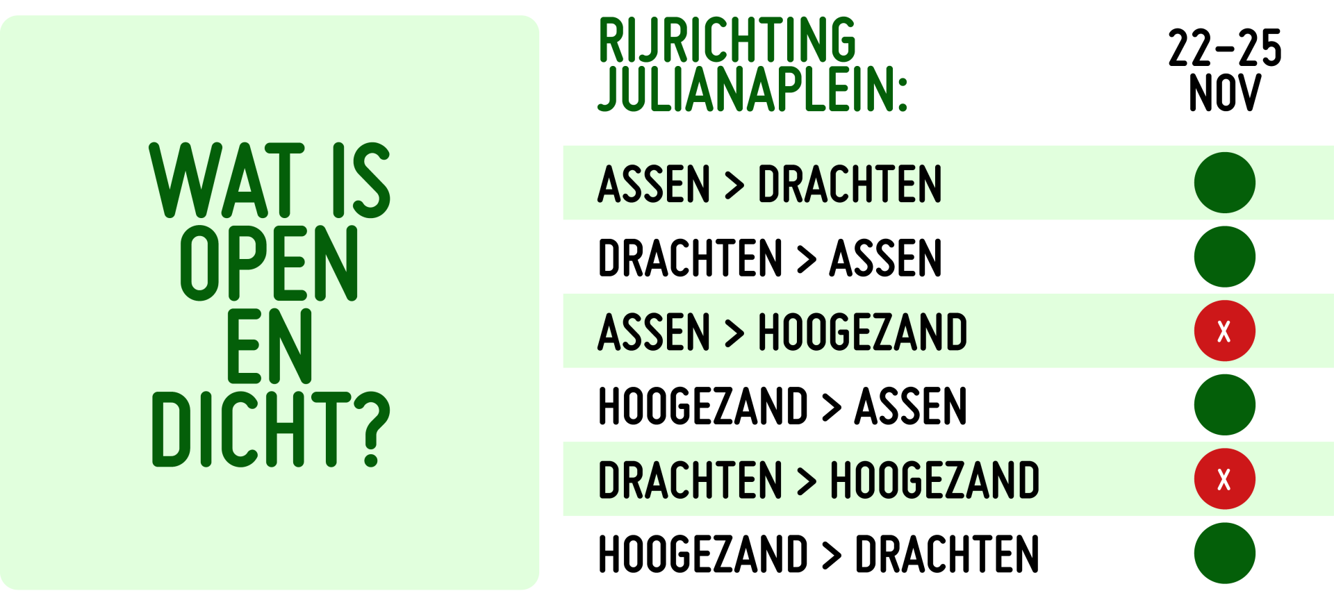 Van vrijdag 22 november 20.00 uur tot maandag 25 november 05.00 uur is de zuidelijke ringweg afgesloten van het Julianaplein tot de Europaweg voor verkeer richting Hoogezand. In de andere richting is er een rijstrook minder beschikbaar, maar blijft de weg verder open.