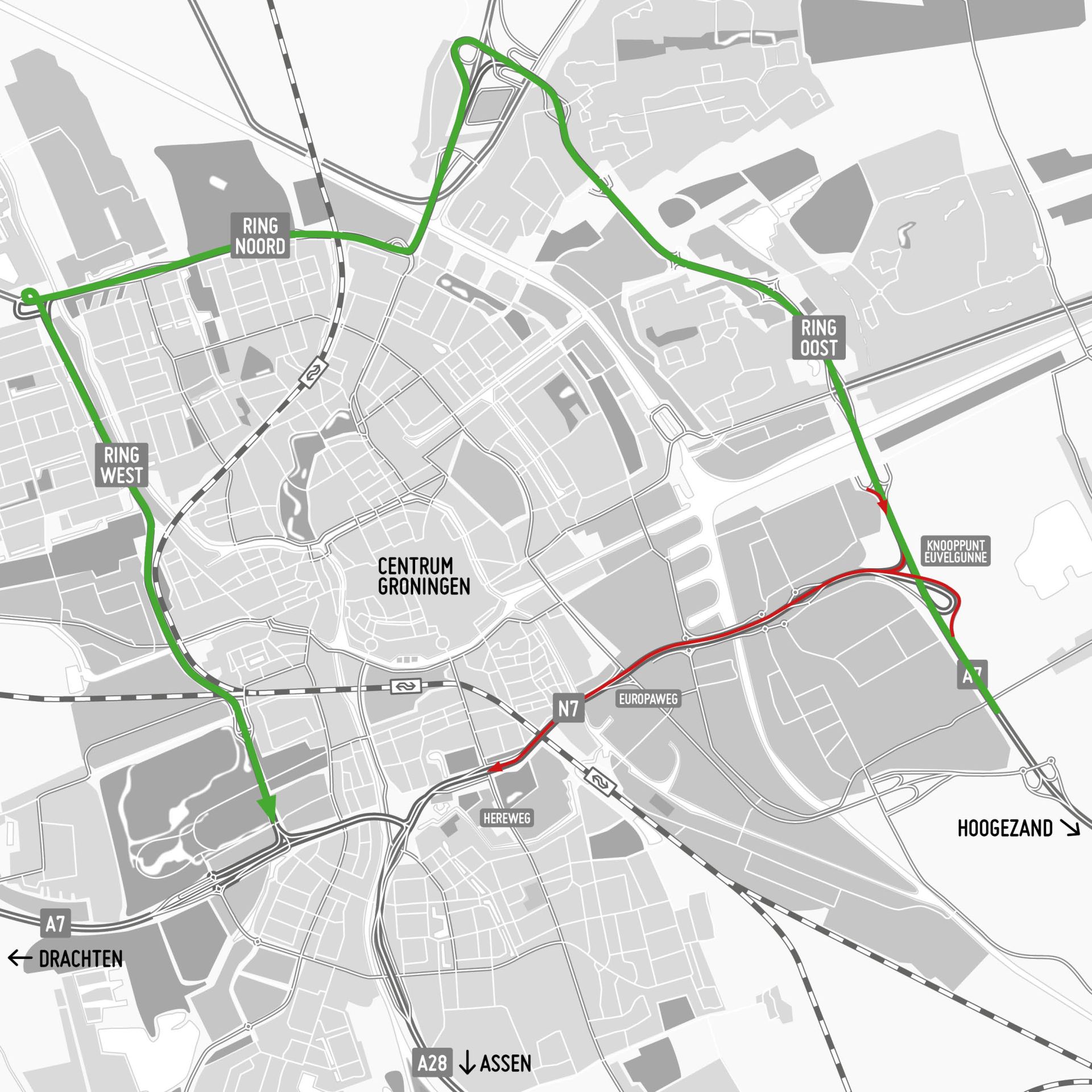 Komend weekend, van vrijdag 24 februari 22.00 uur tot maandag 27 februari 06.00 uur, is de zuidelijke ringweg (N7) afgesloten van knooppunt Euvelgunne tot aan de Hereweg. De afsluiting is voor verkeer richting het Julianaplein. Het verkeer wordt omgeleid via de andere ringwegen.