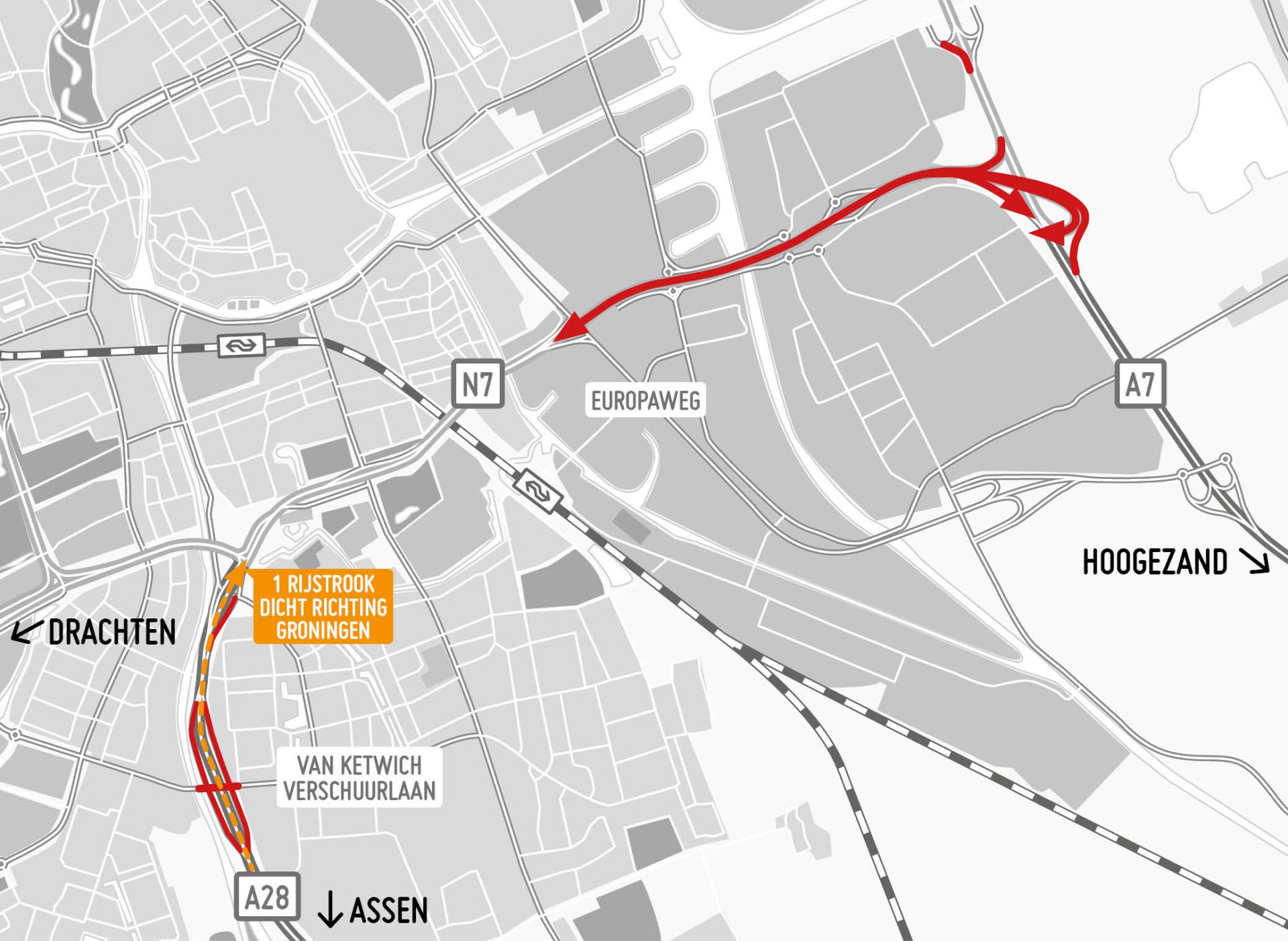In de zomer zijn er ook enkele grote afsluitingen en wegversmallingen bij de A28. Dit is nodig om de A28 te verbreden. Zowel in juli als in augustus is de A28 tussen Groningen-Zuid en het Julianaplein een weekend helemaal afgesloten. De toe- en afritten bij Groningen-Zuid zijn deze zomer zeven weken dicht. Dat geldt ook voor de nieuwe afrit van de A28 naar het centrum.