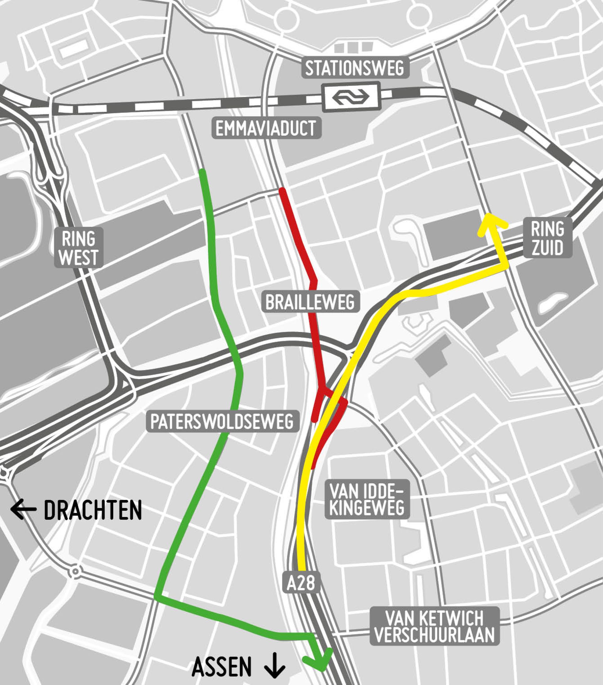 Van donderdag 2 maart 06.00 uur tot maandag 6 maart 05.00 uur zijn het Emmaviaduct en de Brailleweg dicht. Ook de toerit naar en afrit Groningen-Centrum vanaf de A28 is afgesloten.