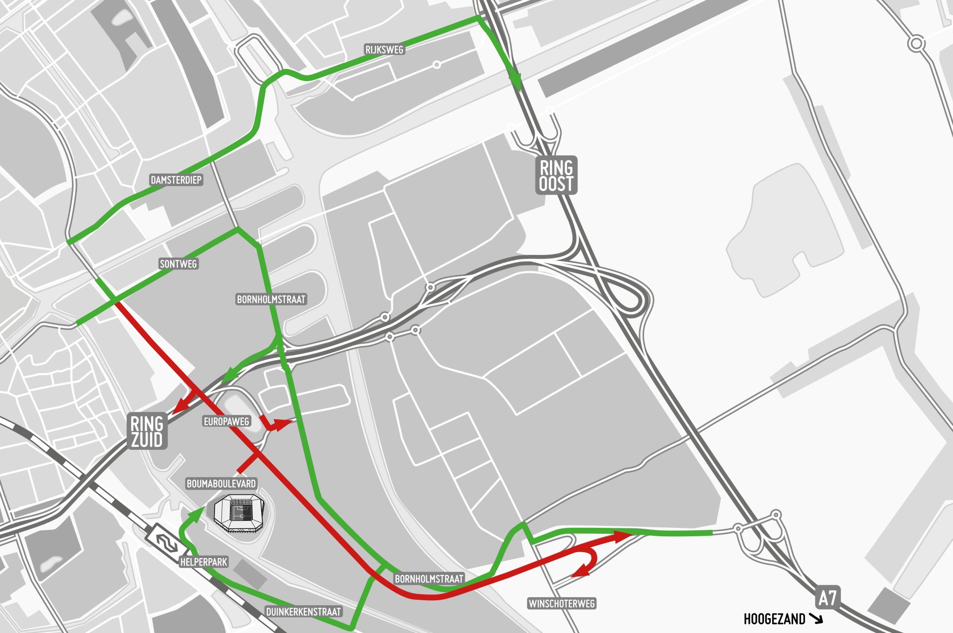Verkeer vanuit het centrum richting Hoogezand rijdt via het Damsterdiep, de Rijksweg en Ring Oost. Wil je richting de Boumaboulevard (Euroborg)? Je kunt dan via de Bornholmstraat en de Duinkerkenstraat rijden. Kom je uit het centrum en wil je richting Drachten/Assen, dan wordt je geleid via de Sontweg en de nieuwe oprit bij de Bornholmstraat.