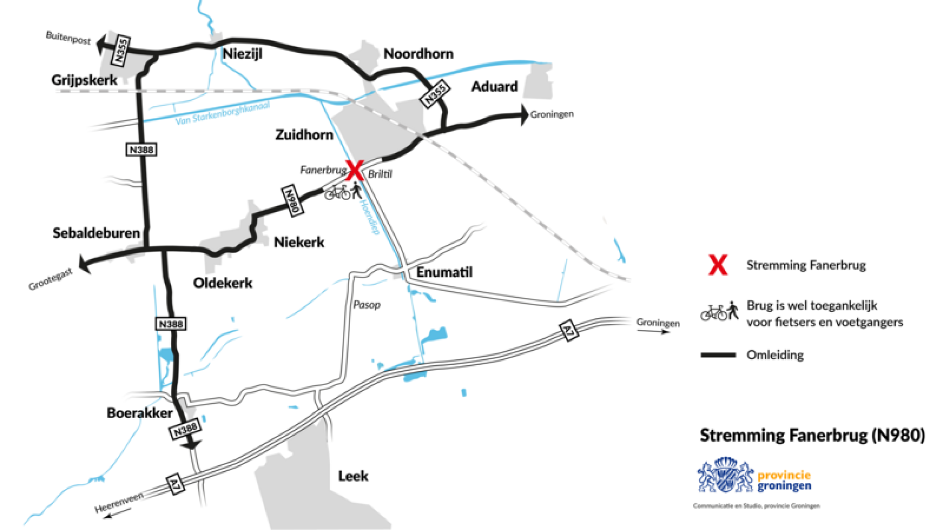 Het doorgaand verkeer tussen Zuidhorn en Niekerk/Oldekerk moet omrijden via de provinciale wegen N355 (Niezijl) en N388 (Boerakker). De omleidingsroute wordt met borden aangegeven.