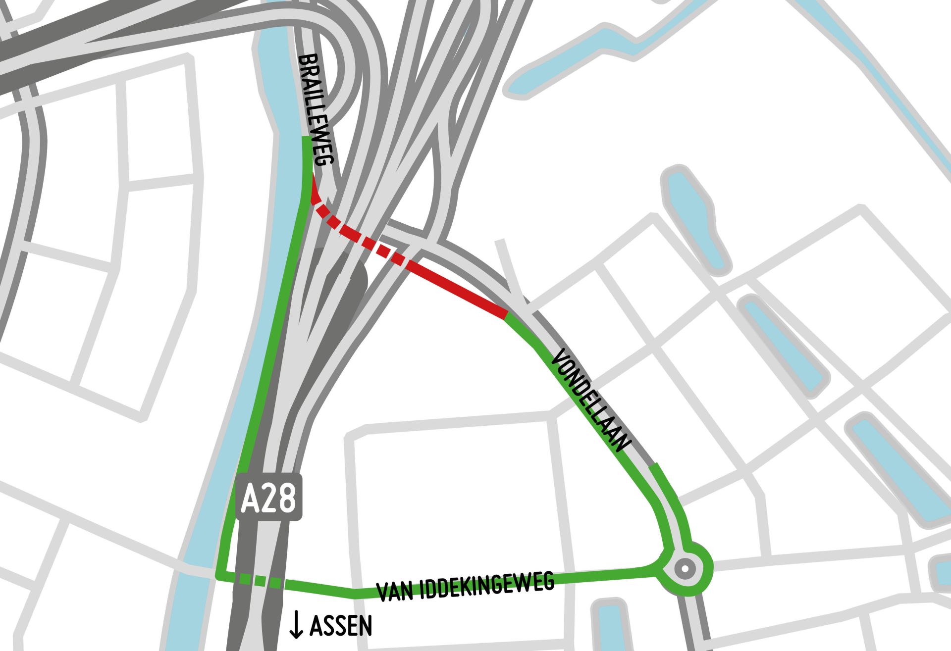 Fietsers worden omgeleid via het fietspad langs het Noord-Willemskanaal (Julianaweg) en kunnen via de Van Iddekingeweg onder de A28 door. Andersom geldt dezelfde route: kom je vanaf de Vondellaan, dan fiets je via de Van Iddekingeweg en het Julianapad richting de Brailleweg.