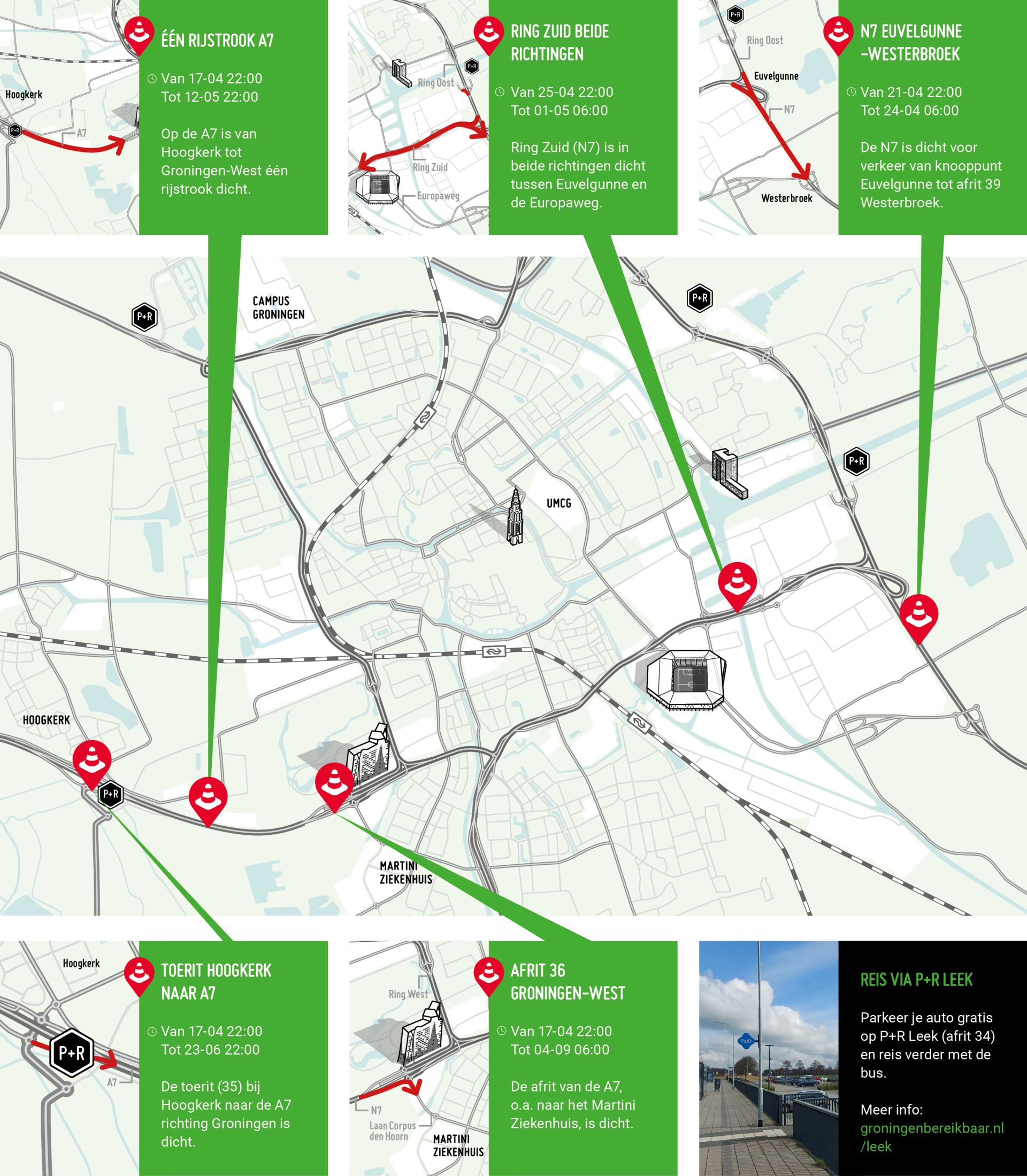 Vanaf maandag 17 april zijn er meer werkzaamheden die starten. Zo is de Petrus Campersingel in één richting dicht. De Peizerweg is tussen de Admiraal de Ruyterlaan en de Paterswoldseweg afgesloten voor alle verkeer richting de Paterswoldseweg. Ook gaat de fietsonderdoorgang bij Hoogkerk onder de A7 dicht.