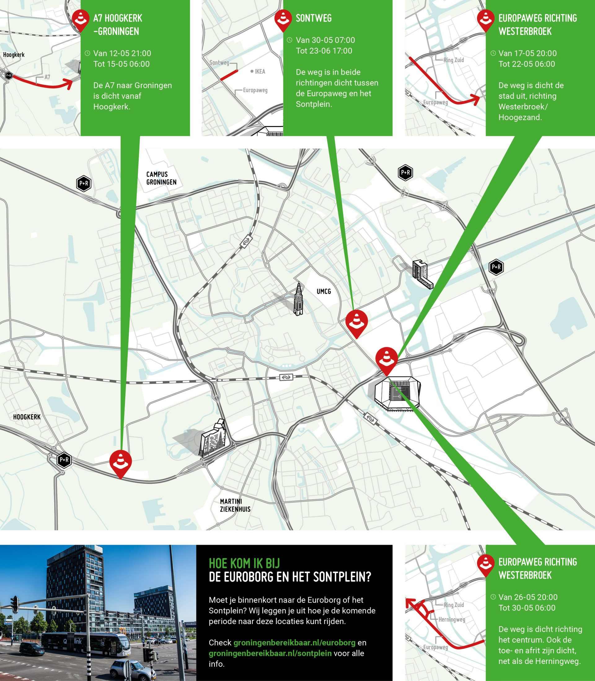 - Tijdens Pinksteren is de Europaweg dicht richting de stad. Ook is de afrit (38) van de zuidelijke ringweg naar de Europaweg dan dicht.