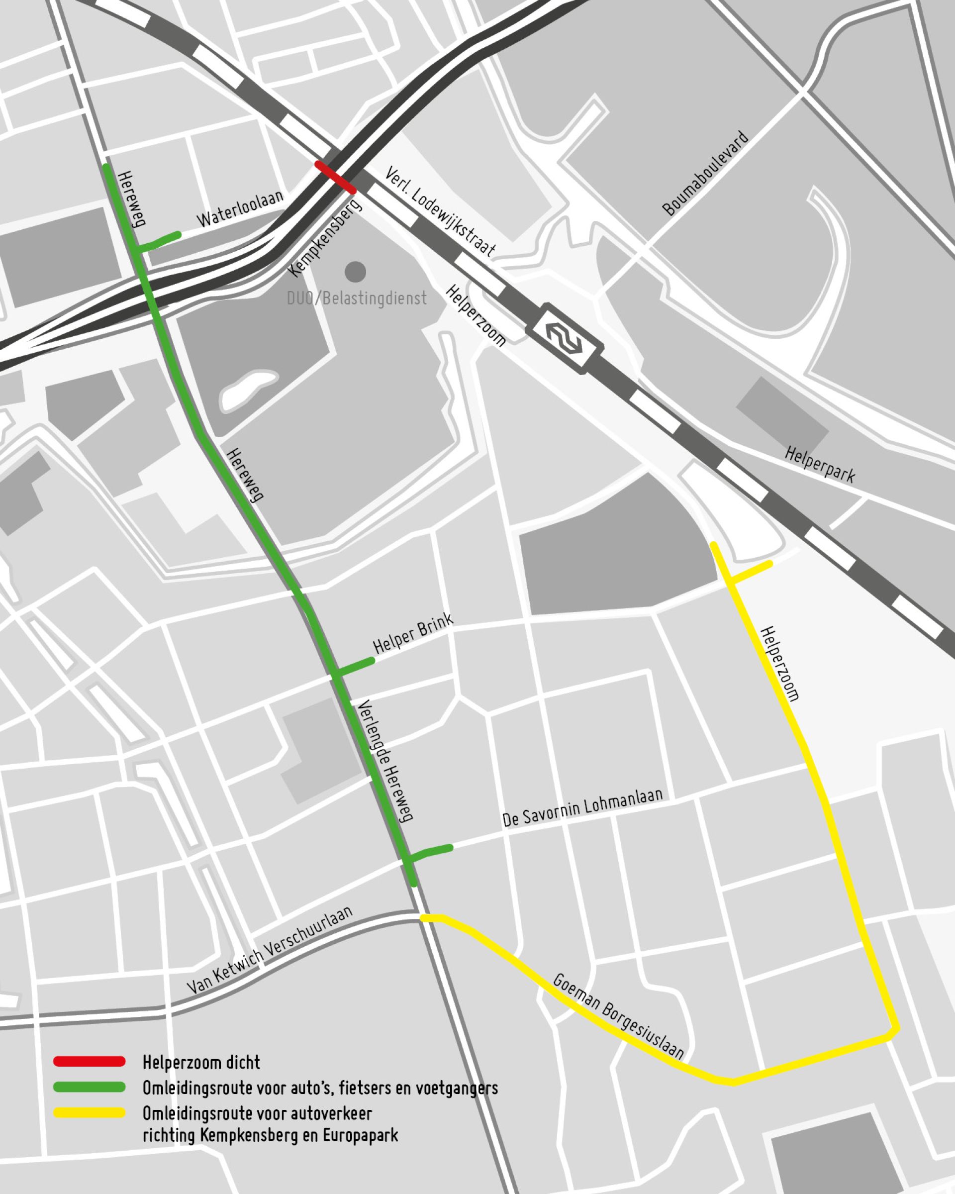 Zowel autoverkeer als fietsers en voetgangers worden omgeleid via de Hereweg. Autoverkeer richting de Kempkensberg (DUO/Belastingdienst) of richting Europapark kan omrijden via de Goeman Borgesiuslaan.