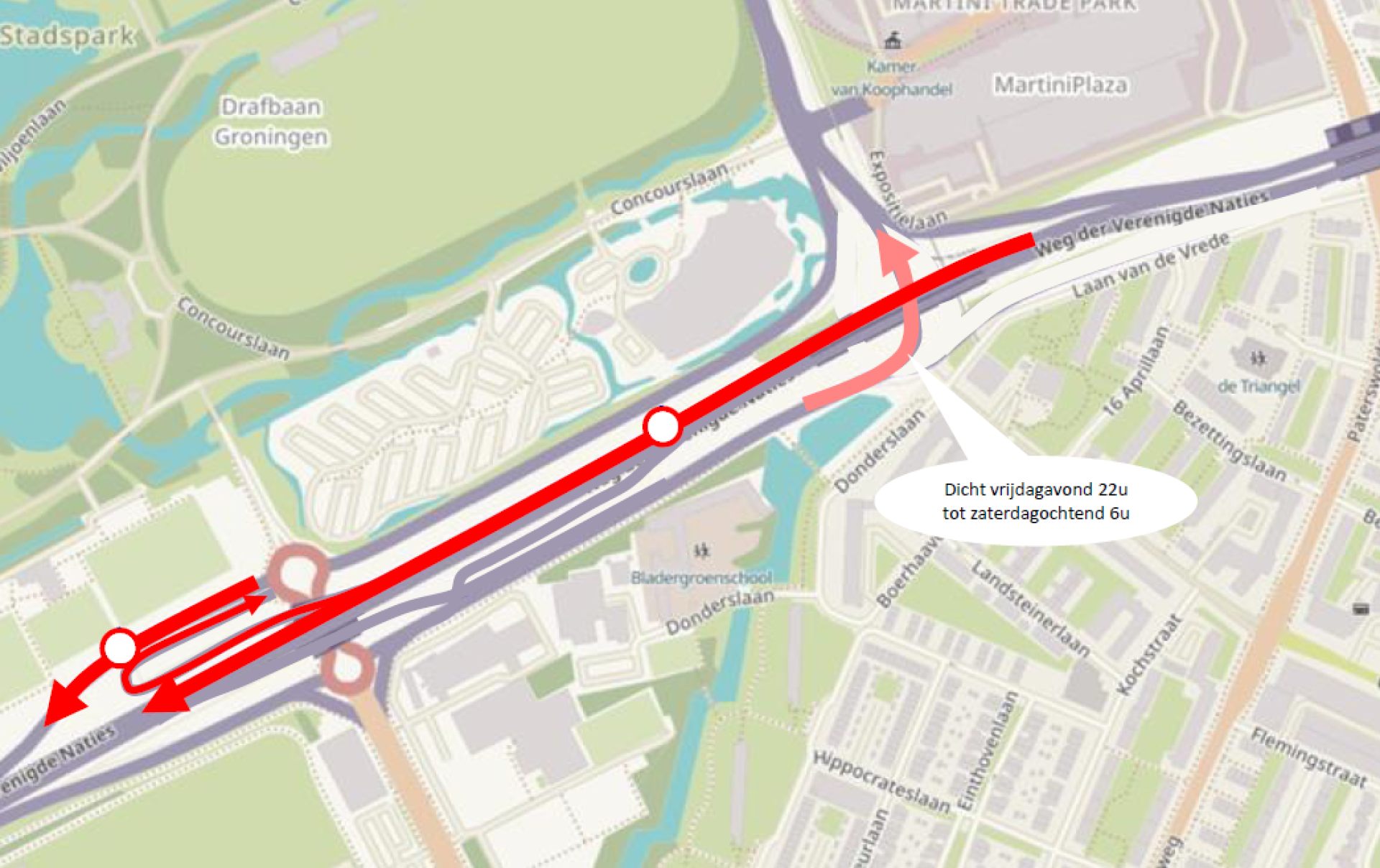 Van vrijdag 7 oktober 22.00 uur tot zaterdag 8 oktober 06.00 uur is ook de verbinding van Laan Corpus den Hoorn naar Ring West (N370) dicht. Dat betekent ook dat verkeer vanuit Drachten naar de westelijke ringweg moet omrijden.