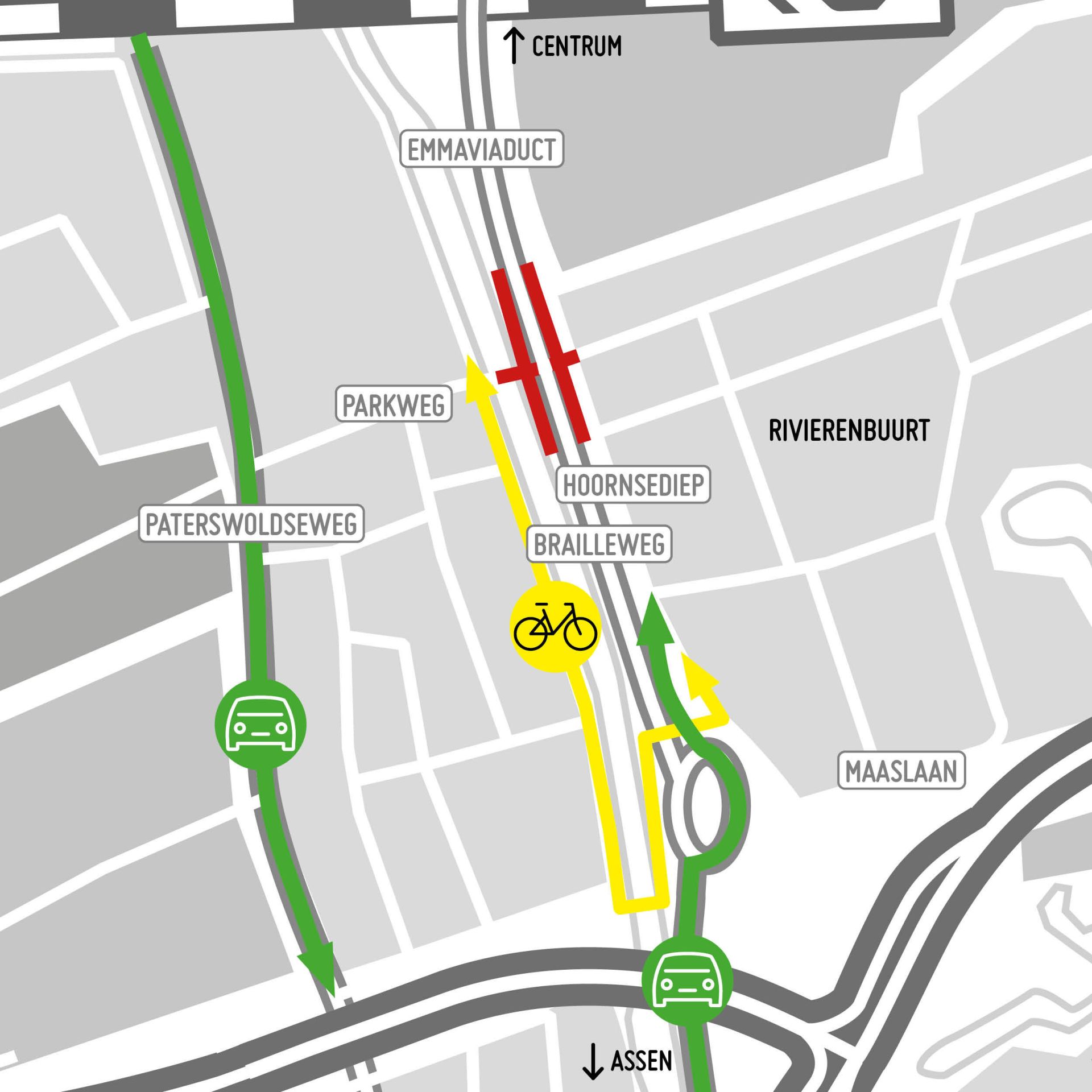 Fietsers worden omgeleid via de Muntingbrug. Vanaf de Parkweg slaan zij rechtsaf naar het Hoornsediep, langs het Noord-Willemskanaal. Via de Muntingbrug rijd je vervolgens naar de nieuwe ovonde bij de Brailleweg. Vanaf daar kun je de Rivierenbuurt bereiken. Andersom geldt dezelfde route.