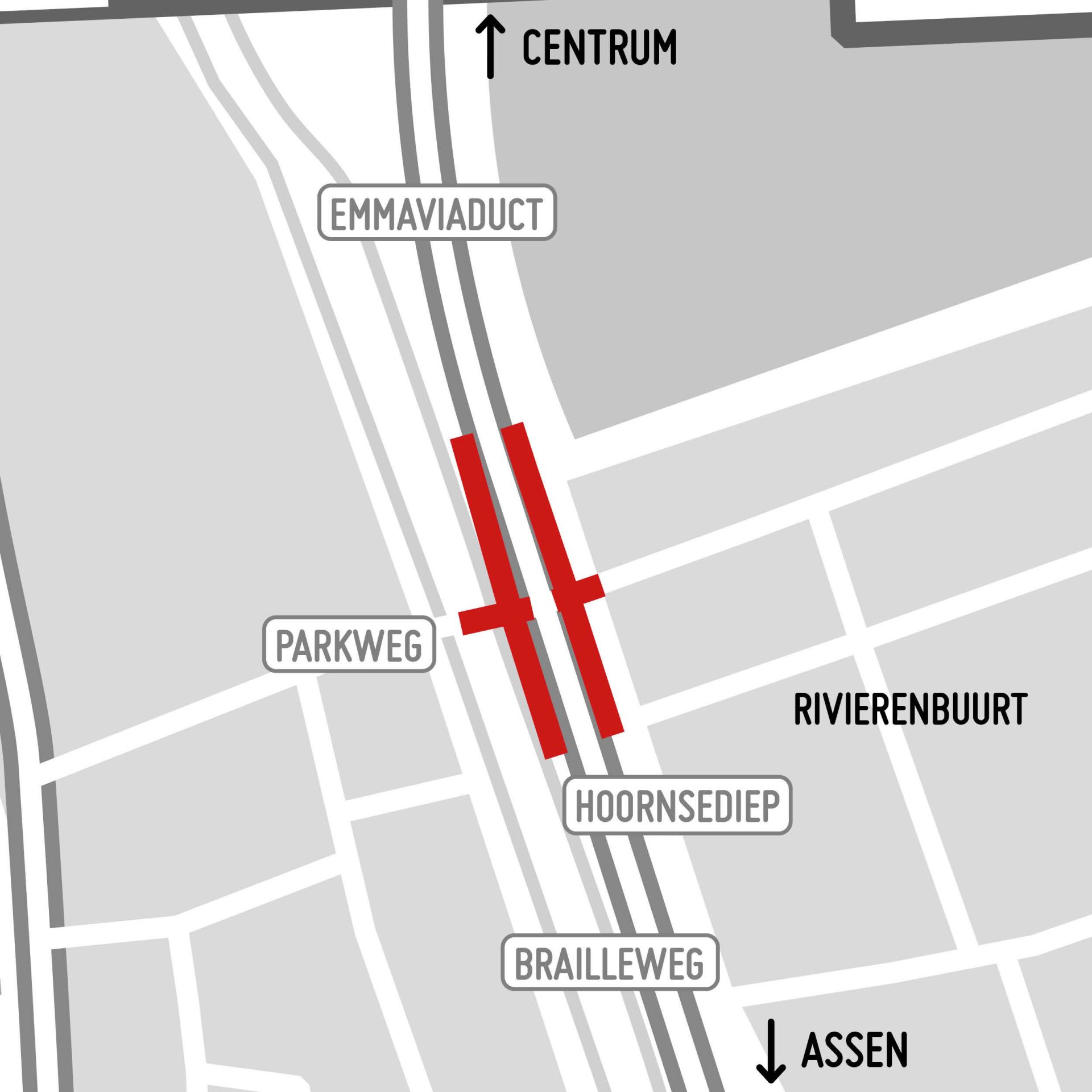 Het kruispunt van de Parkweg met de Brailleweg en het Hoornsediep is van maandag 30 oktober 06.00 uur tot maandag 13 november 06.00 uur dicht voor alle verkeer. Dit betekent dat alle richtingen op deze kruising afgesloten zijn. Verkeer naar de Rivierenbuurt kan gebruikmaken van de nieuwe ovonde bij de Brailleweg en Maaslaan.