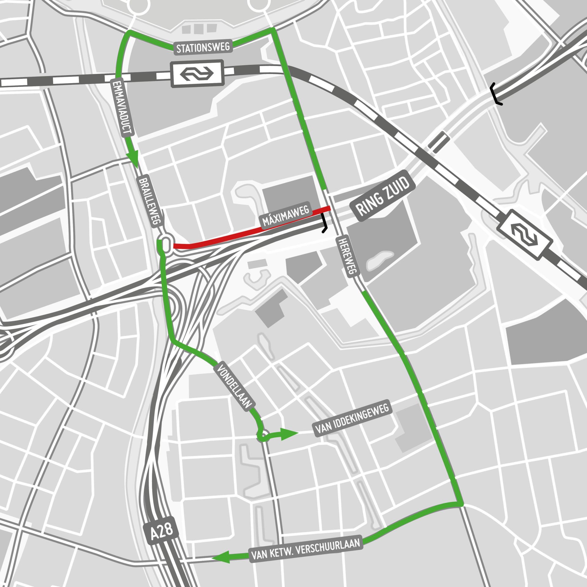 Rijd je op het Emmaviaduct of op de Brailleweg en ben je onderweg naar Helpman, dan word je omgeleid via de Vondellaan en de Van Iddekingeweg. Je komt vervolgens op de Hereweg terecht.