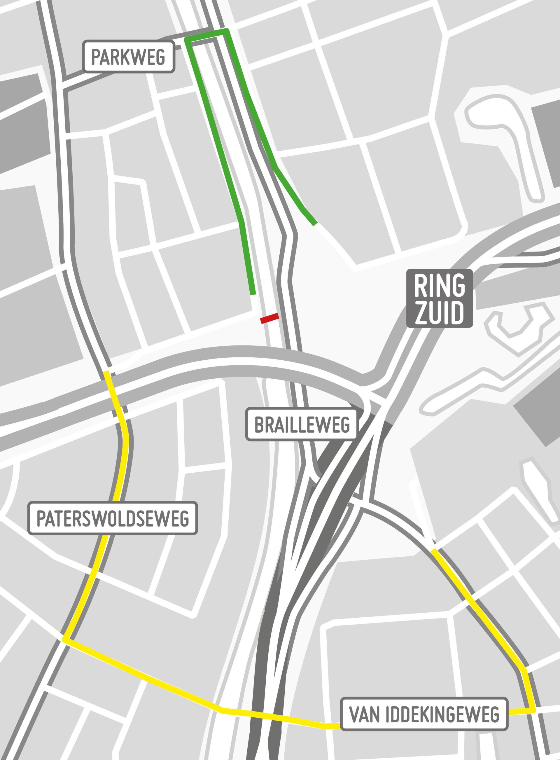 Vanwege de sloop van de oude brug in de zuidelijke ringweg, moet ook de fietstunnel bij Gyas dicht van maandag 16 mei 06.00 uur tot vrijdag 20 mei 22.00 uur. Fietsers en voetgangers worden omgeleid via de Paterswoldseweg. Ook in de zomer wordt deze verbinding een paar keer afgesloten.
