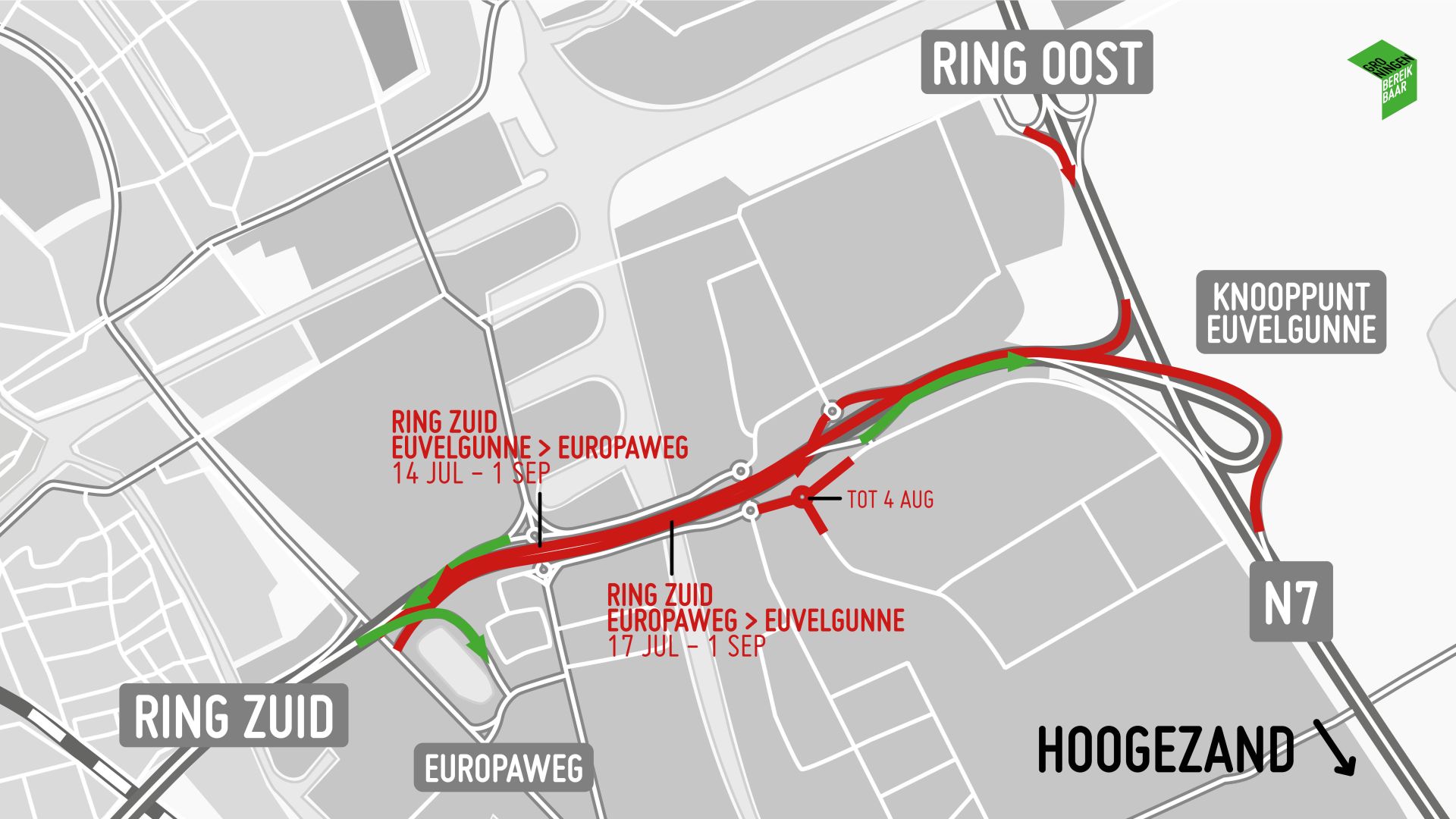 Het is echt een zomer vol werkzaamheden in Groningen. Zo wordt er ook gewerkt aan de zuidelijke ringweg. Deze zomer wordt net als vorig jaar het oostelijk gedeelte van Ring Zuid afgesloten. Van vrijdag 14 juli tot vrijdag 1 september is de weg dicht van Euvelgunne tot de Europaweg in beide richtingen.