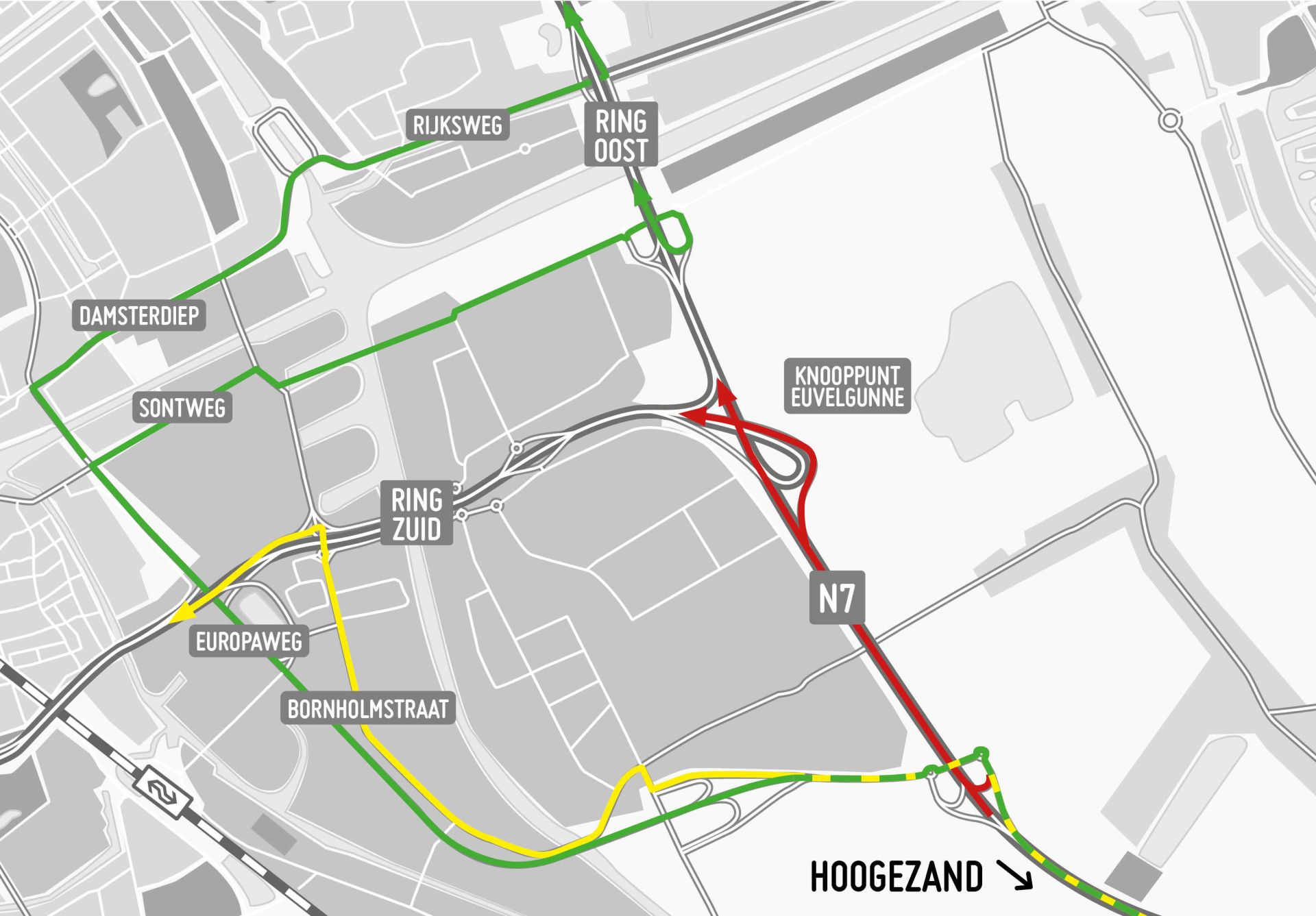 Verkeer uit de richting Hoogezand dat naar de oostelijke ringweg (N46) wil, kan omrijden via de Europaweg, Damsterdiep en de Rijksweg naar Ring Oost. Of vanaf de Europaweg naar de Sontweg en zo naar Ring Oost.