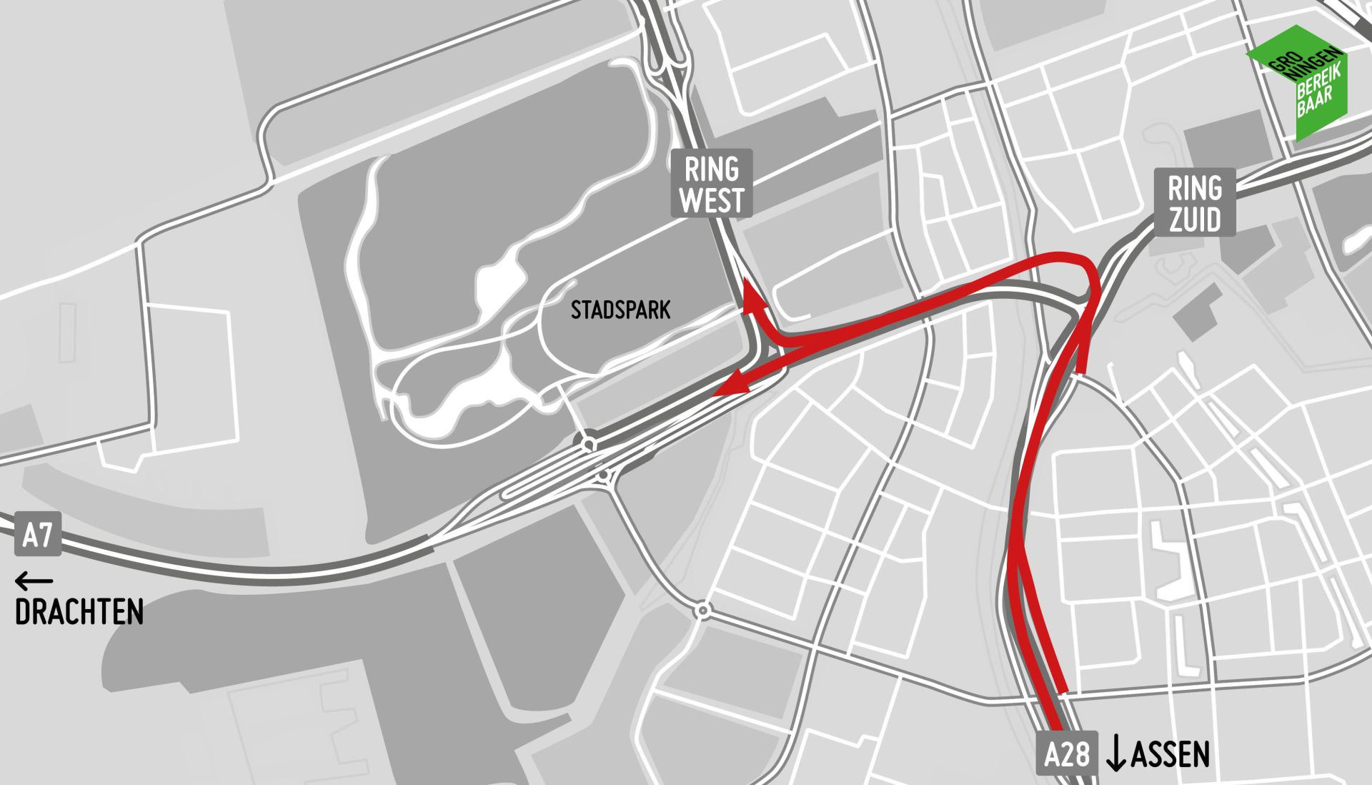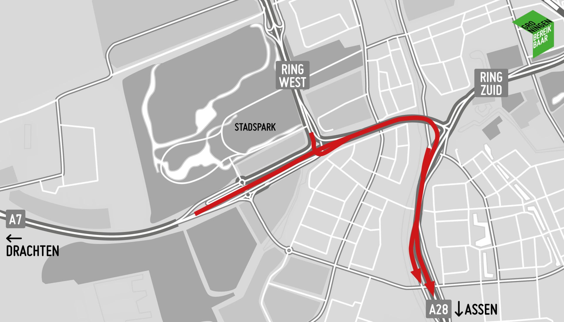 Vanaf 11 juli is de A28 dicht vanaf het Julianaplein richting Groningen-Zuid. Dit betekent dat ook een deel van Ring Zuid, vanaf Groningen-West tot aan het Julianaplein, afgesloten is.