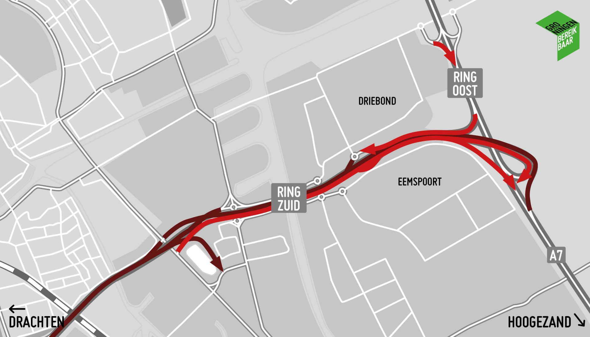 De zuidelijke ringweg is al lange tijd in één richting dicht, voor verkeer richting Julianaplein. De toerit vanaf de Europaweg richting Hoogezand is open, maar gaat nu een aantal nachten dicht. Datzelfde geldt voor de verbinding van Ring Oost naar Ring Zuid en voor de toerit Meerstad.
