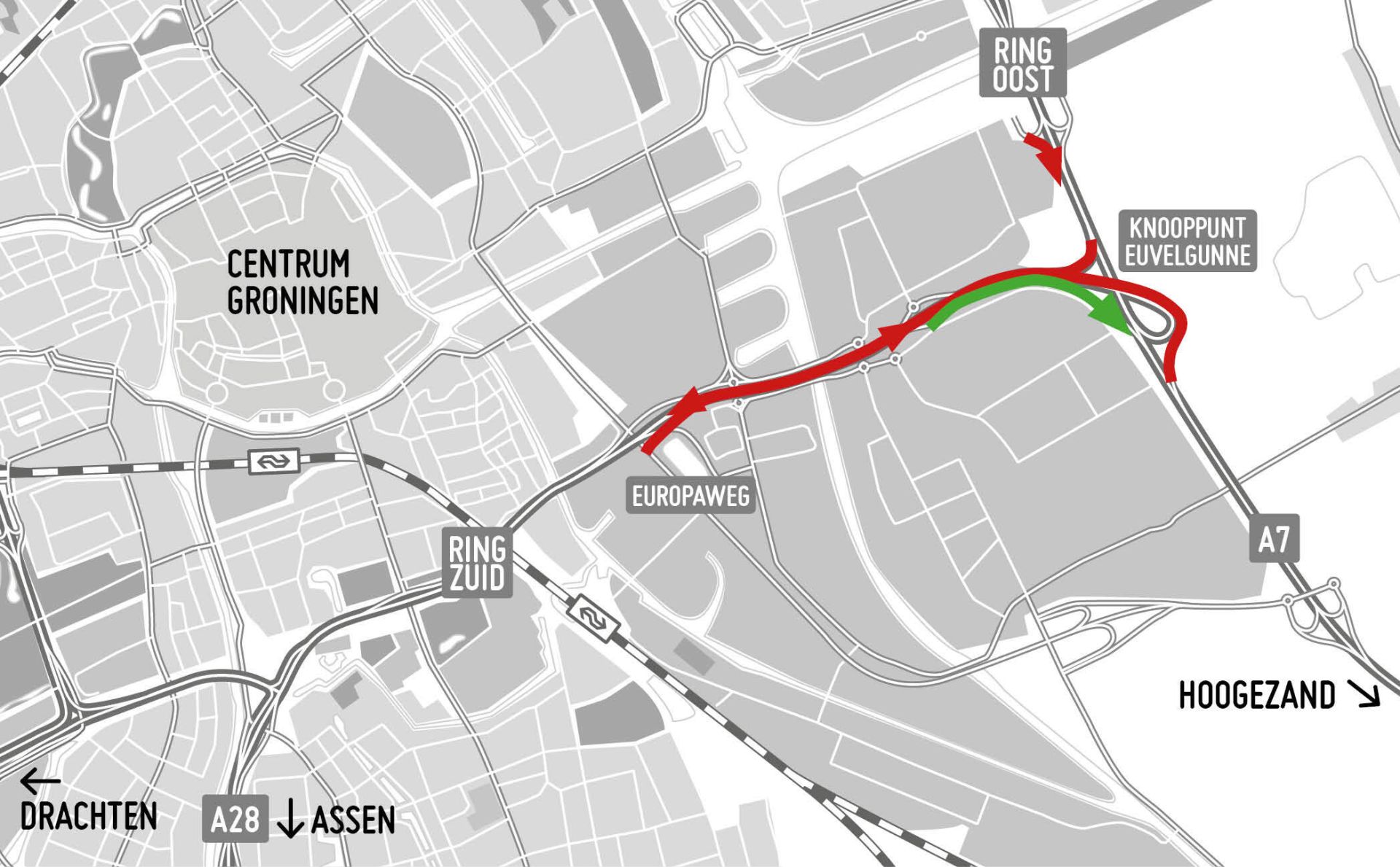 Ring Zuid is richting het Julianaplein dicht van knooppunt Euvelgunne tot de toerit bij de Bornholmstraat. In de andere richting is de weg afgesloten van de Europaweg tot afrit Groningen-Zuidoost (38). Ook toerit Meerstad (1) op de oostelijke ringweg (46) is tijdens de werkzaamheden dicht. Deze afsluitingen gelden van: