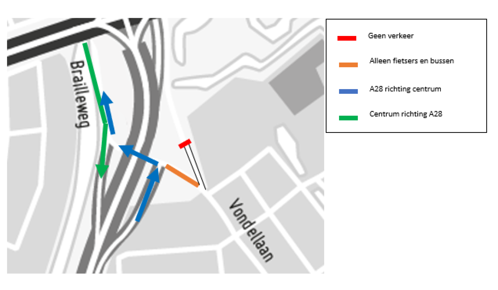Voor verkeer vanuit het centrum is de Brailleweg na 8 november alleen nog de toegangsweg tot de oprit van de A28 richting het zuiden (Groningen-Zuid/Assen). Vanuit het centrum kun je dan dus niet meer via de Brailleweg naar de Vondellaan rijden. Wil je naar de Vondellaan of een andere straat in De Wijert, dan rijd je vanaf de Brailleweg de A28 op en neem je de afslag Groningen-Zuid (Van Ketwich Verschuurlaan).