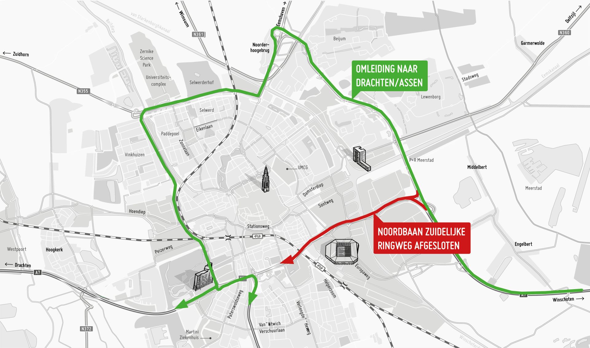Vanwege een spoedreparatie aan het asfalt is de zuidelijke ringweg (N7) vannacht, vrijdag 15 januari, van 22.00 uur tot zaterdag 16 januari 06.00 uur afgesloten tussen knooppunt Euvelgunne en de Hereweg voor verkeer richting Drachten/Assen. Het verkeer wordt omgeleid via de oostelijke, noordelijke en westelijke ringweg.
