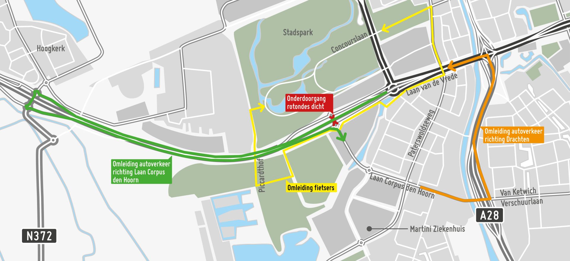 Fietsers tussen de Laan Corpus den Hoorn en Stadspark kunnen ook niet gebruikmaken van de onderdoorgang bij de rotondes. Zij hebben twee alternatieve routes: via het tunneltje bij Piccardthof of via de Laan van de Vrede - Paterswoldseweg - Concourslaan (gele routes).
