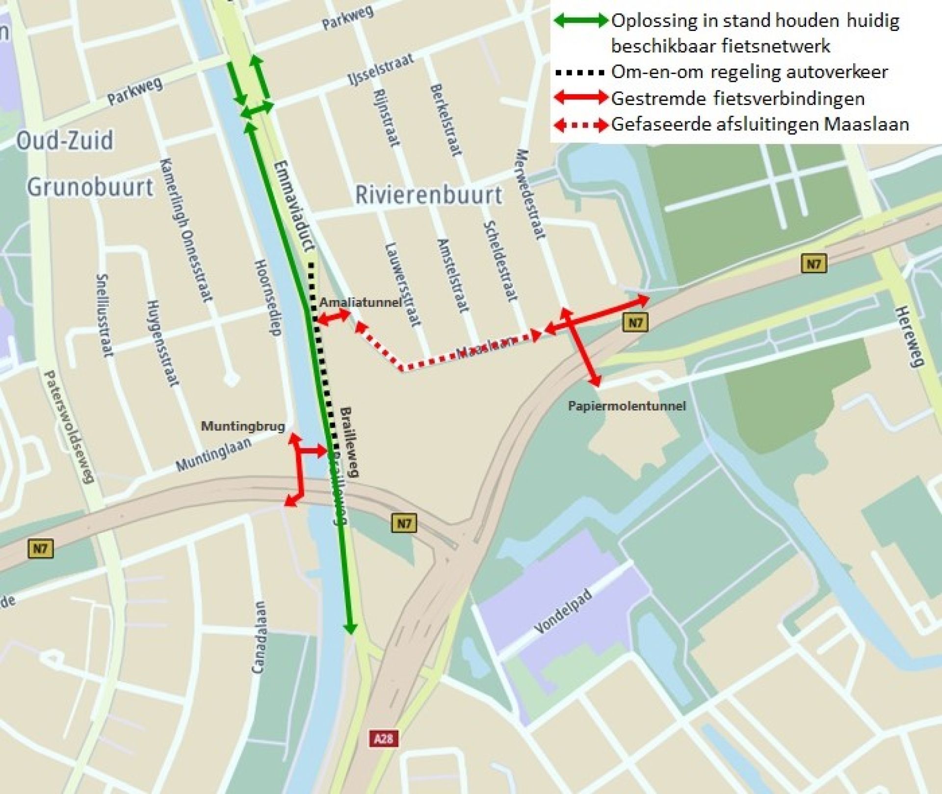 Het fietspad op de Brailleweg is gecreëerd omdat fietsers anders in een groot gebied geen mogelijkheid hebben om van noord naar zuid te fietsen, of omgekeerd. De Muntingbrug, de fietsbrug over het Noord-Willemskanaal, kan nog niet open omdat de technische installaties nog niet compleet zijn. Met het oog op de planning van het Julianaplein moet nu wel een begin worden gemaakt met het afbreken van de Amaliatunnel onder het Emmaviaduct. Fietsers en voetgangers worden nu via de Brailleweg geleid en kunnen via een tijdelijk fietspad doorrijden tot aan de Parkbrug.