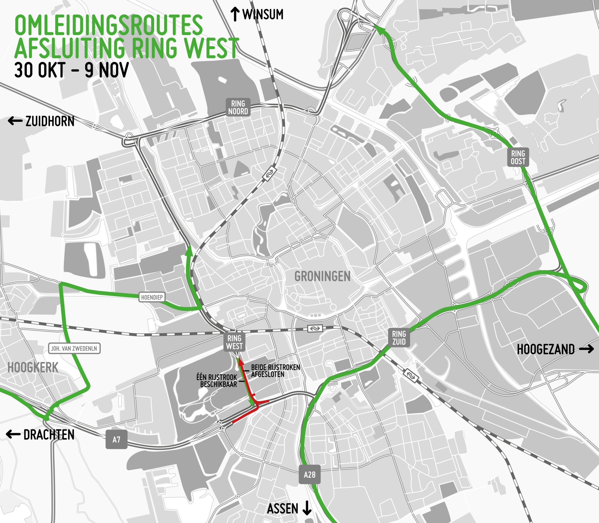Van dinsdag 6 december 06.00 uur tot woensdag 7 december 22.00 uur is een deel van de westelijke ringweg afgesloten voor verkeer richting het noorden (richting Paddepoel/Zuidhorn). Het gaat om het gedeelte vanaf het Vrijheidsplein tot afrit 18 Zeeheldenbuurt (Peizerweg). Verkeer uit de richting Drachten wordt omgeleid via Hoogkerk en het Hoendiep. Verkeer uit andere richtingen wordt omgeleid via de overige ringwegen.