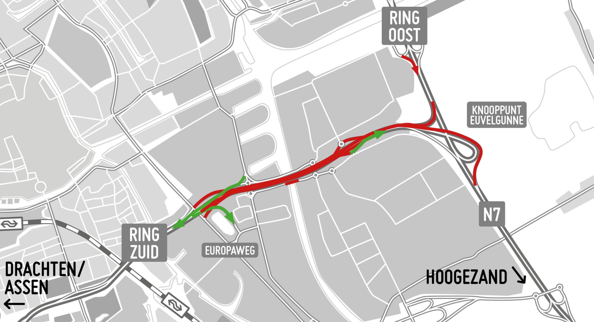 De zuidelijke ringweg van Groningen is van vrijdag 16 februari 20.00 uur tot zondag 18 februari 19.00 uur in beide richtingen afgesloten tussen de Europaweg en knooppunt Euvelgunne. Verkeer wordt omgeleid via de toe- en afrit Groningen-Europapark en de Europaweg.
