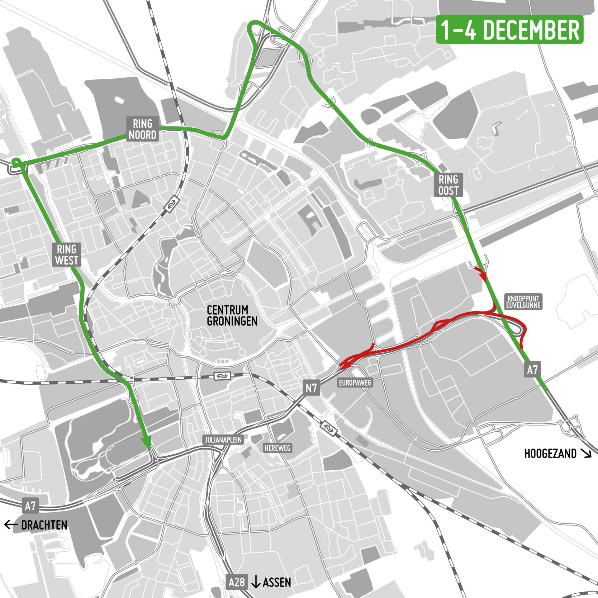 De zuidelijke ringweg van Groningen (N7) is in de weekenden van 1 tot 4 december, van 8 tot 11 december en van 15 tot 18 december dicht. De weg is afgesloten tussen de Europaweg en knooppunt Euvelgunne. In het eerste weekend is de ringweg alleen dicht voor verkeer richting het Julianaplein (Assen/Drachten), in de andere twee weekenden is de weg in beide richtingen afgesloten. Het verkeer wordt via de overige ringwegen omgeleid.