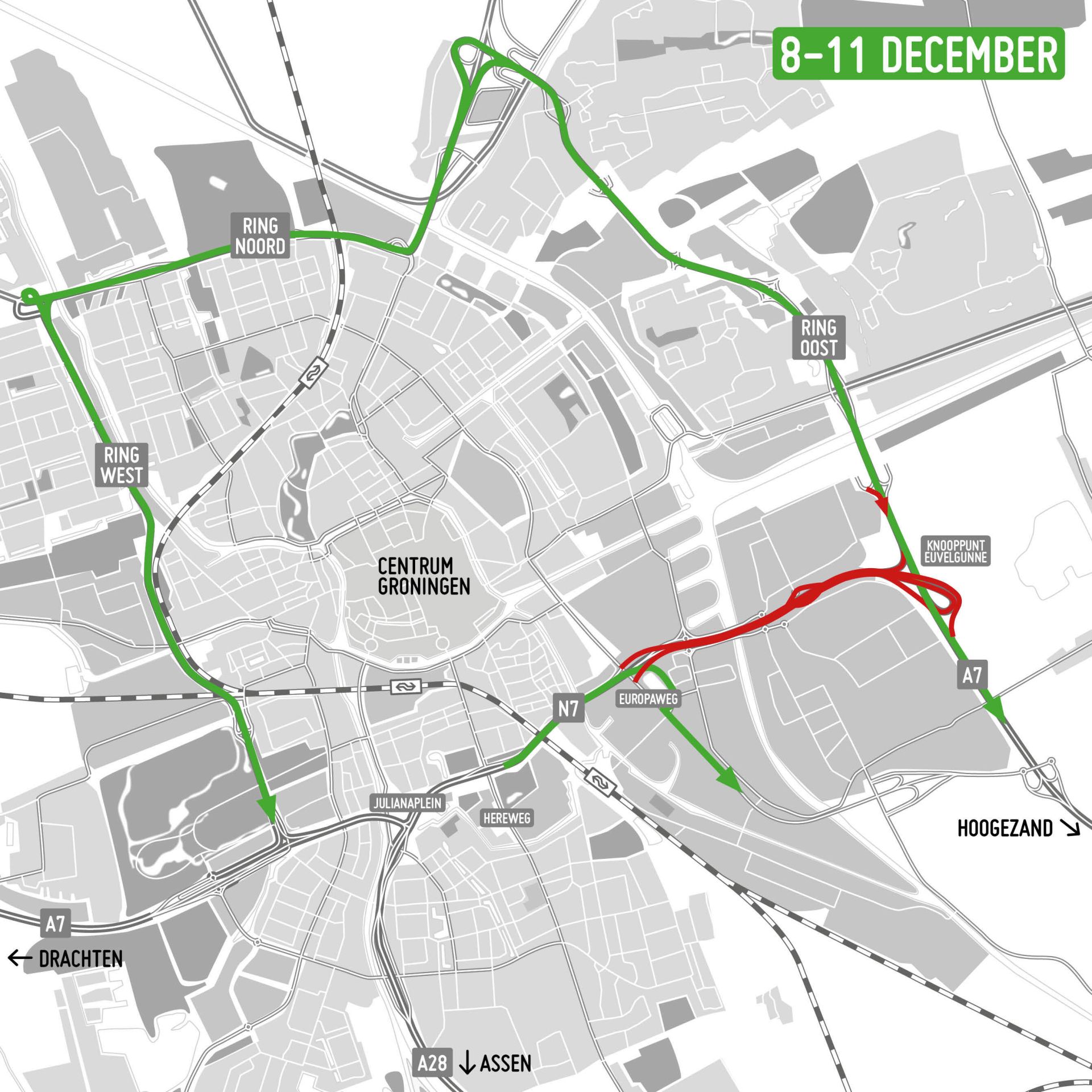 Kom je vanuit de richting Drachten (A7) of Assen (A28)? Dan rijd je om via de westelijke, noordelijke en oostelijke ringweg van Groningen. Verkeer op de zuidelijke ringweg kan via afrit 37 Groningen-Europapark en de Europaweg rijden. Ook voor verkeer vanuit Hoogezand (A7) gelden de routes via de overige ringwegen.