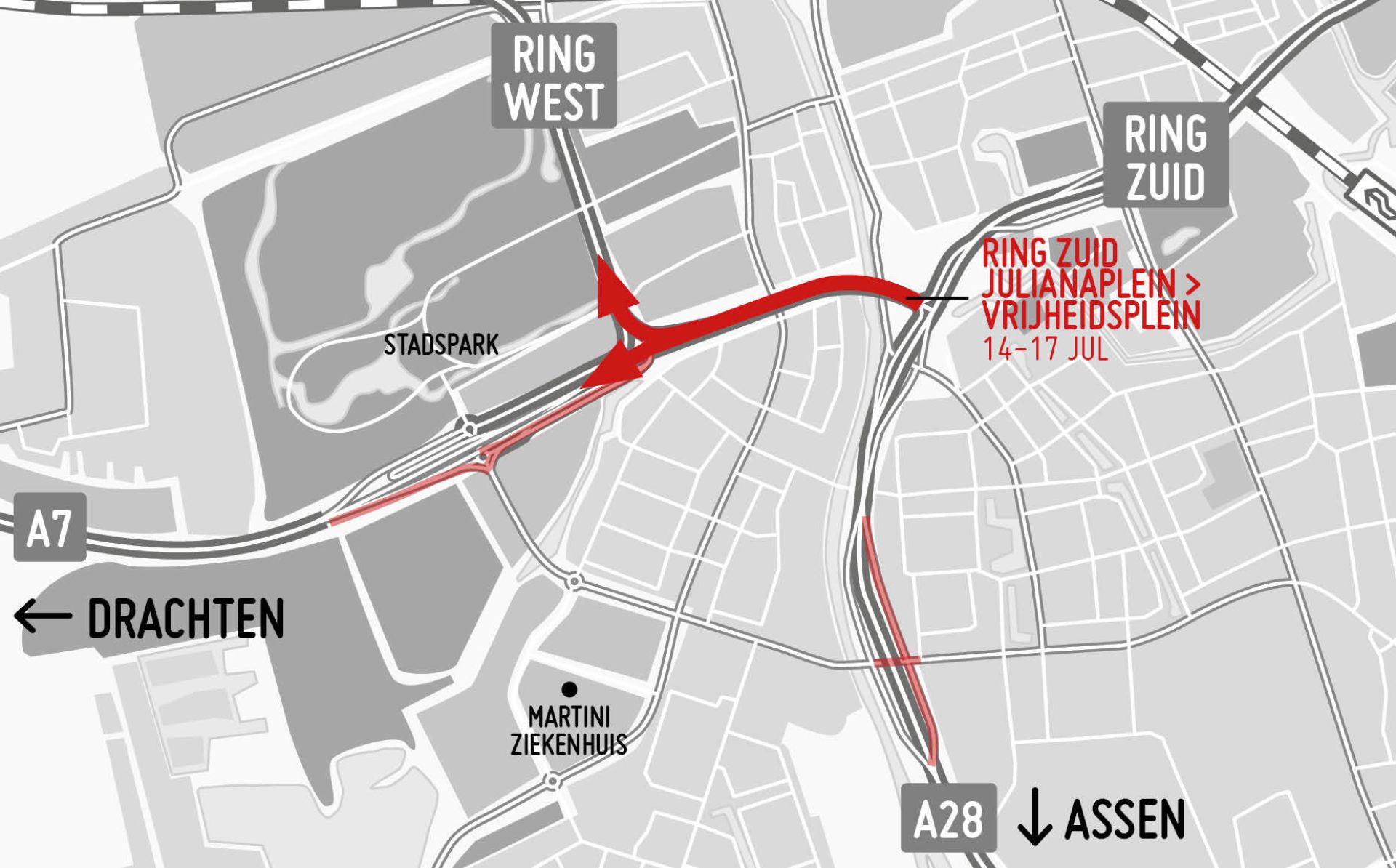 We weten dat het veel afsluitingen zijn deze zomer. En we zijn nog niet klaar. Ook dit weekend komt er nog een afsluiting bij. De zuidelijke ringweg (N7) is van vrijdag 14 juli 22.00 uur tot maandag 17 juli 06.00 uur dicht van het Julianaplein tot de westelijke ringweg. De afsluiting is voor verkeer richting Hoogkerk/Drachten.