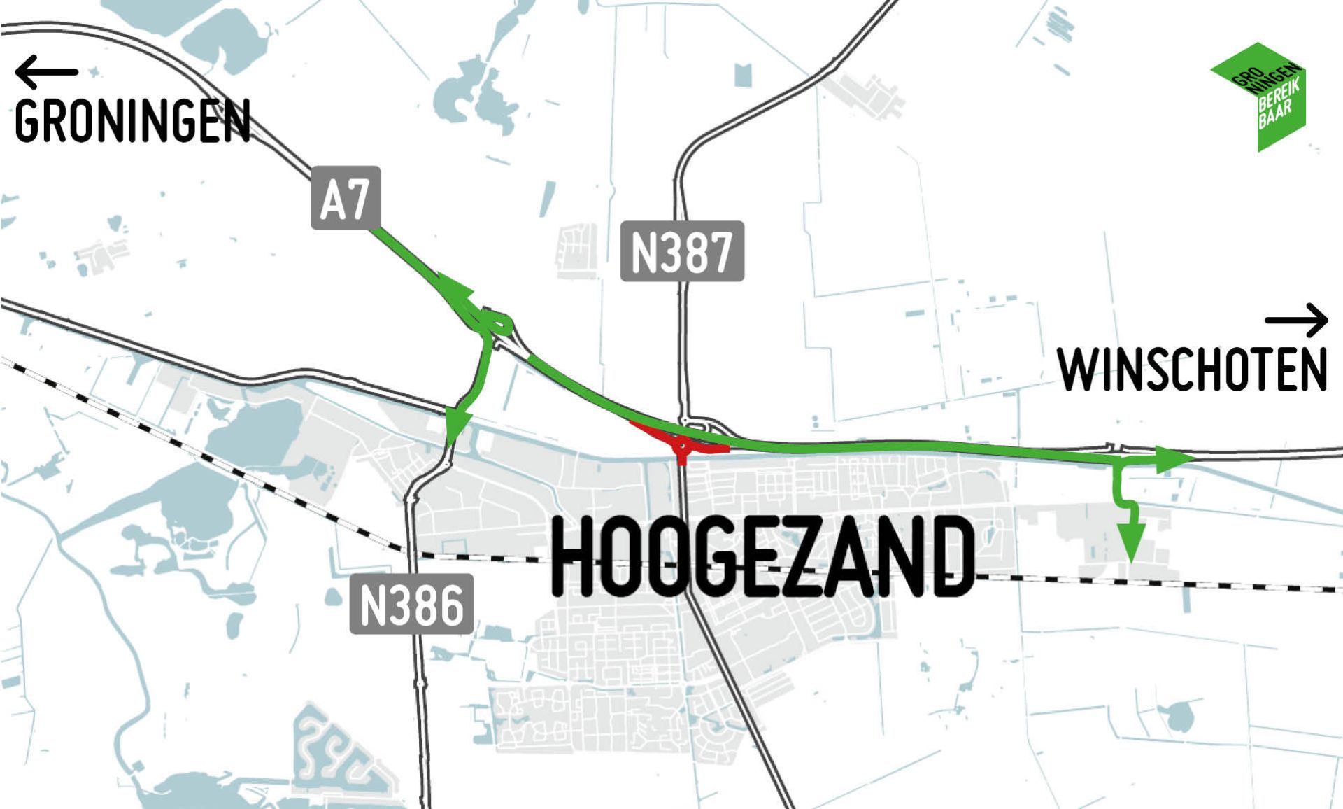 De omleidingsroute door Hoogezand loopt via de Woldweg (N386), Abraham Kuypersingel en De Vosholen. Autoverkeer kan gebruik maken van de op- en afritten van de A7 bij Sappemeer en Foxhol.