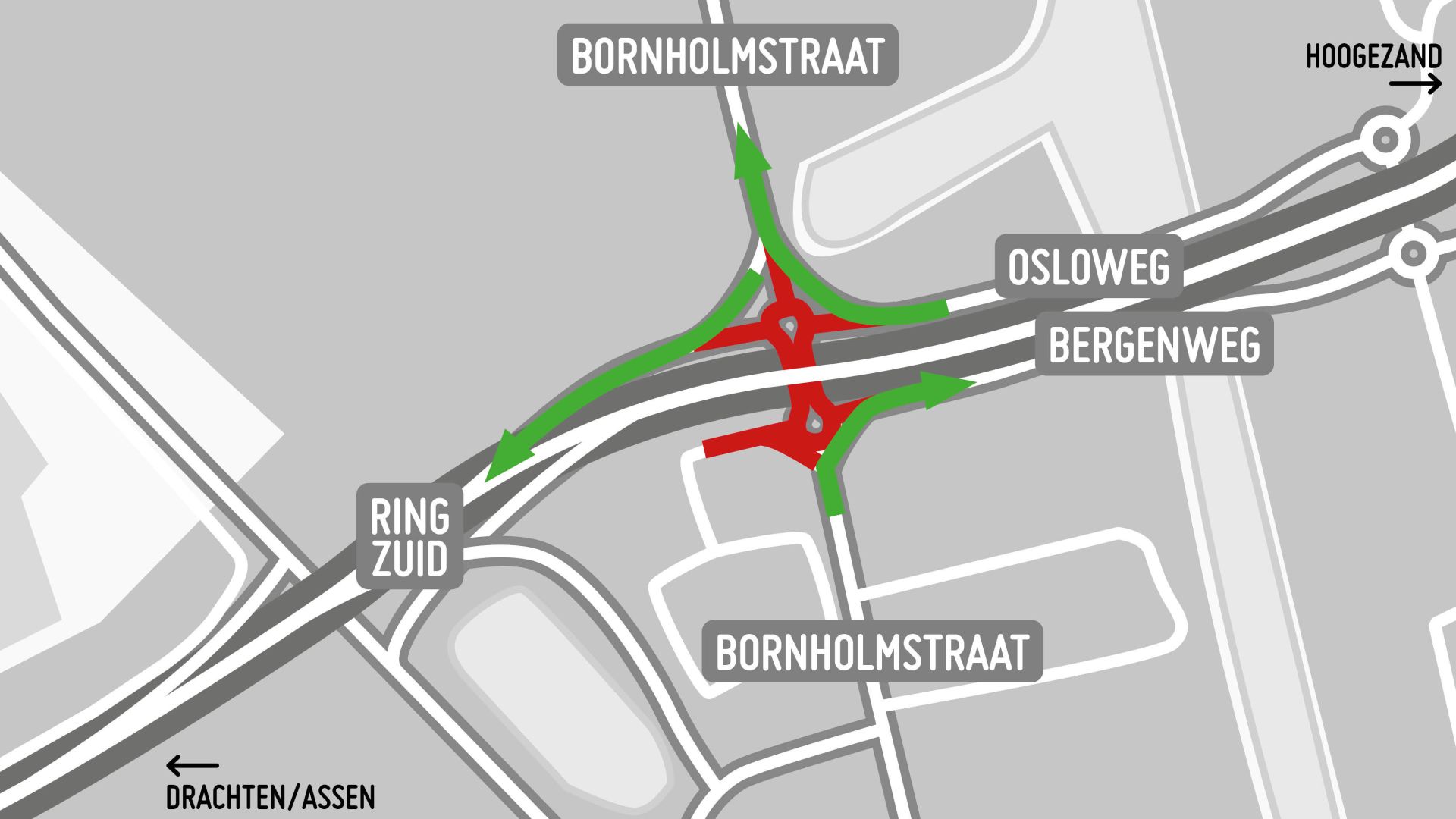 Een deel van de rotondes is wel open. Zo kun je vanaf de Bornholmstraat (ten zuiden van de ringweg) wel de Bergenweg op rijden en kun je vanaf de Osloweg ook de Bornholmstraat (ten noorden van de ringweg) bereiken. De toerit van de Bornholmstraat naar Ring Zuid is eveneens beschikbaar.