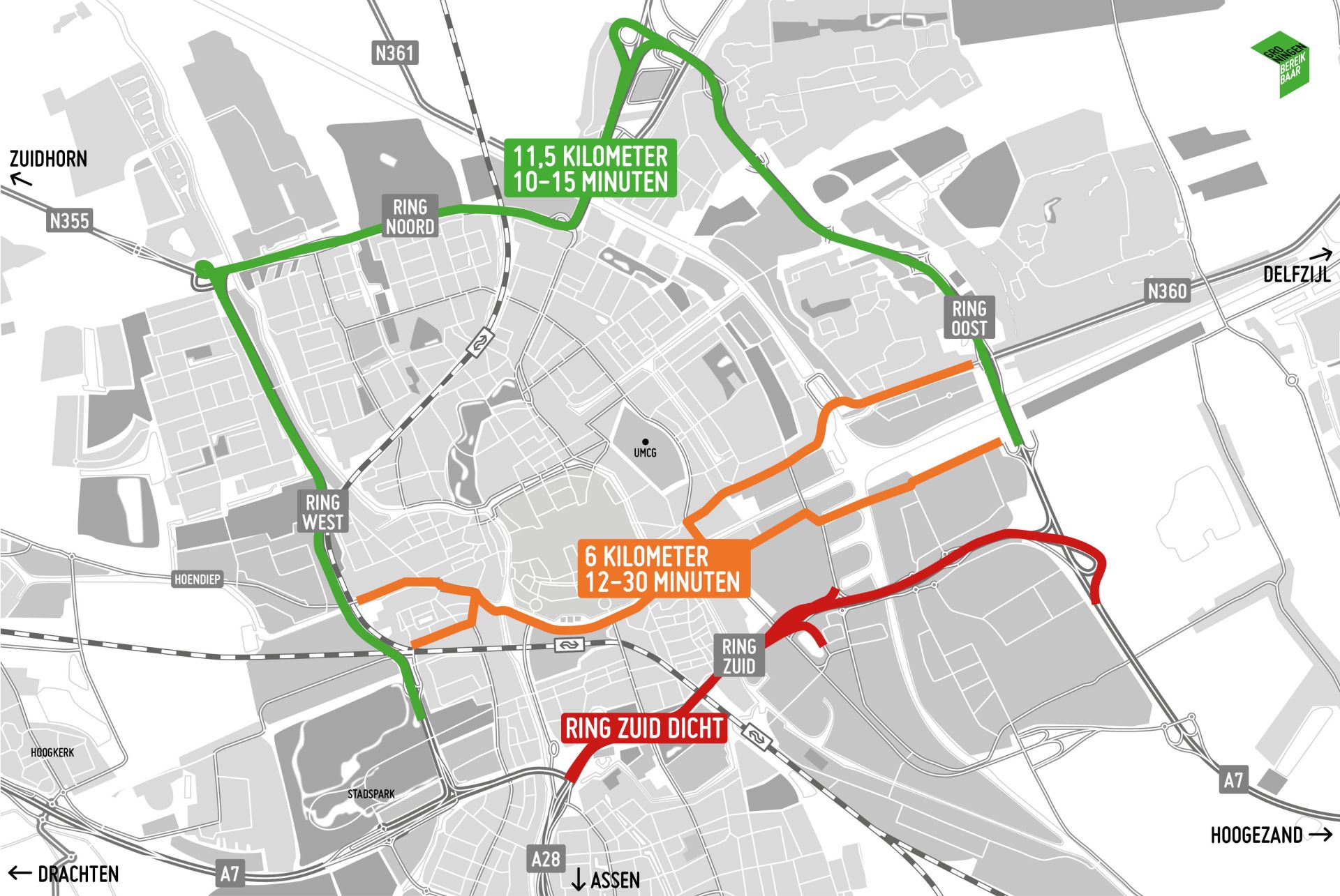 De verkeershinder door Operatie Ring Zuid is zo ernstig dat er 20% minder auto's op het wegennetwerk in en rond Groningen moet rijden om het verkeer door te laten stromen. Hoef je niet met de auto? Reis als het kan met de fiets of het OV. Moet je echt met de auto, houd dan rekening met vertraging. Vertrek op tijd, bereid je reis goed voor en volg de aangegeven omleidingen.